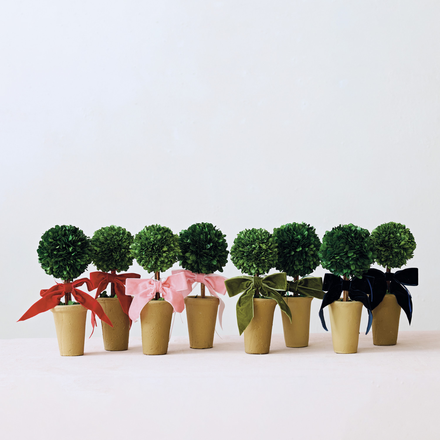 Dried Boxwood Tree in Terra-cotta Pot with Navy Color Velvet Bow