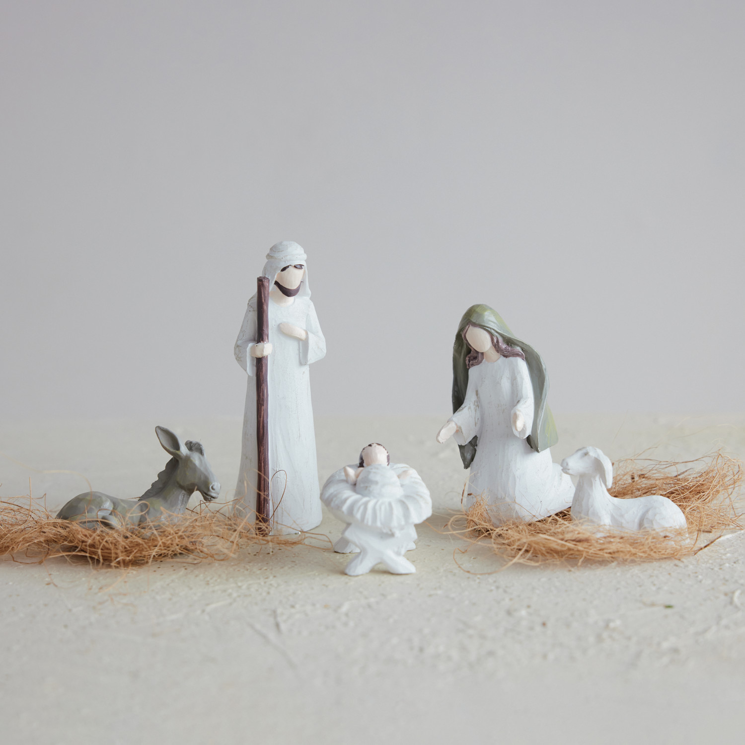 Catalog Name: 1-1/2"H - 4-3/4"H Resin Holy Family w/ Donkey & Sheep, White & Brown, Set of 5