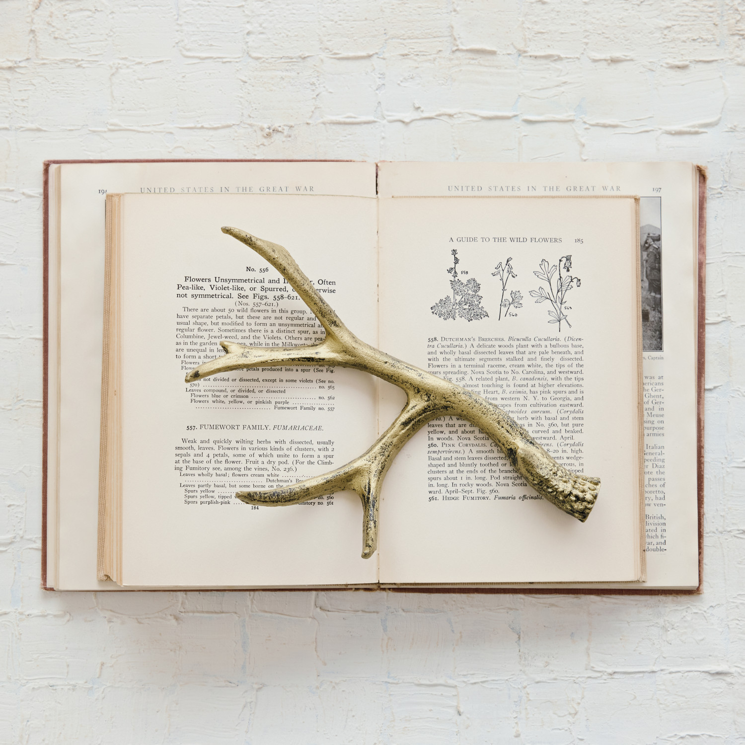 Catalog Name: 10-1/2"L x 5-1/4"W x 2-1/4"H Cast Iron Antler, Distressed Gold Finish
