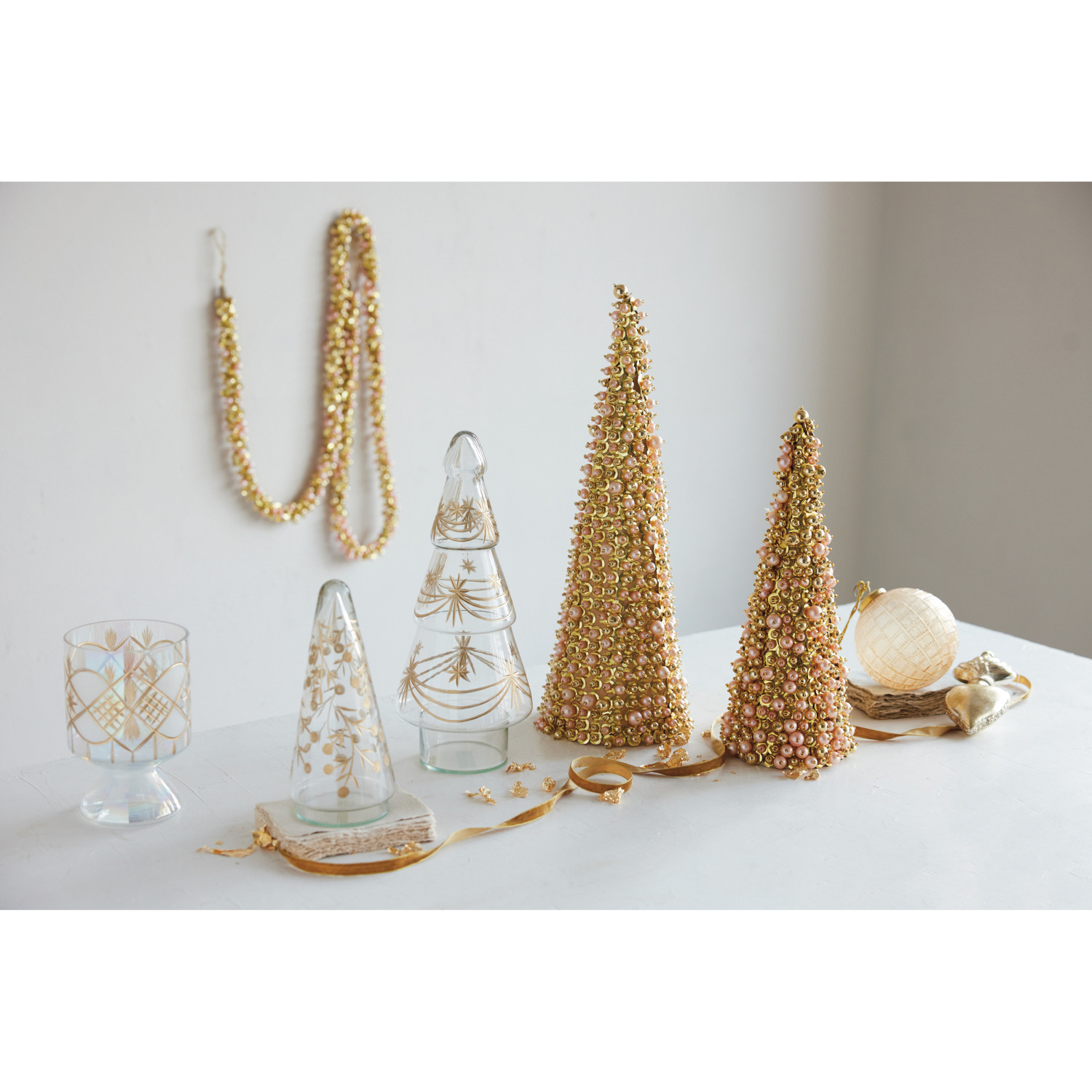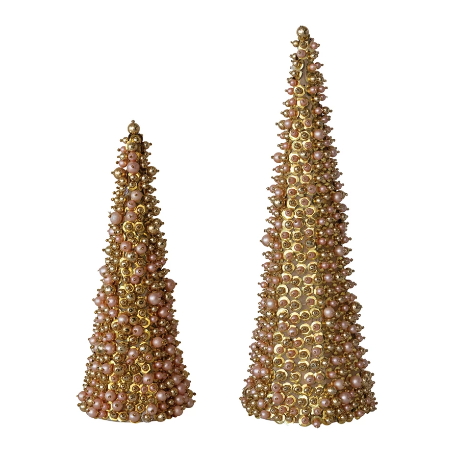 Catalog Name: 5-1/4" Round x 16"H & 4-1/4" Round x 12-1/4"H Faux Pearl & Glass Beaded Trees w/ Sequins, Gold Finish & Pink, Set of 2