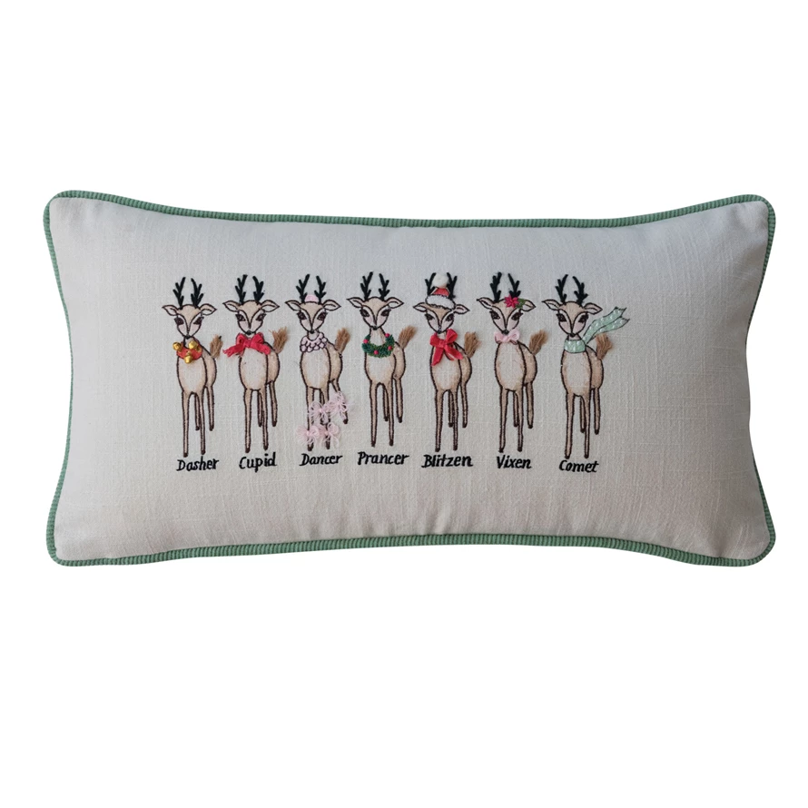 Cotton Slub Printed Lumbar Pillow with Santa's Reindeer, Embroidery, Piping & Velvet Back ©