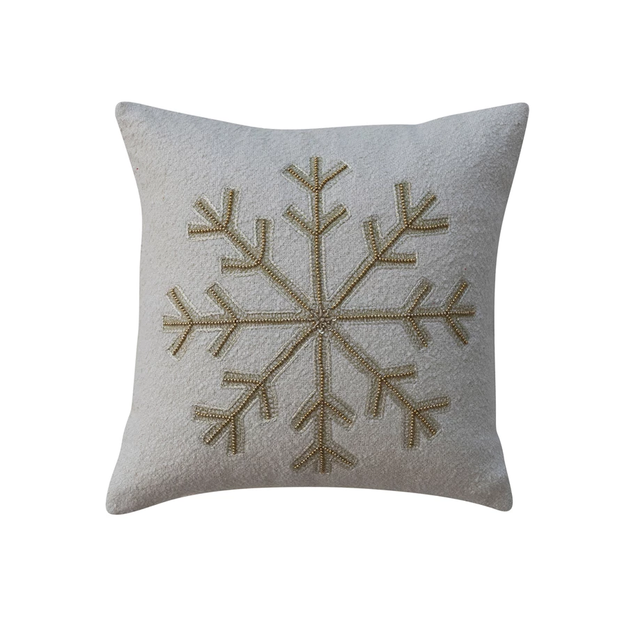 18" Square Cotton Boucle Pillow with Embroidered Snowflake & Beads, Cream & Gold Color