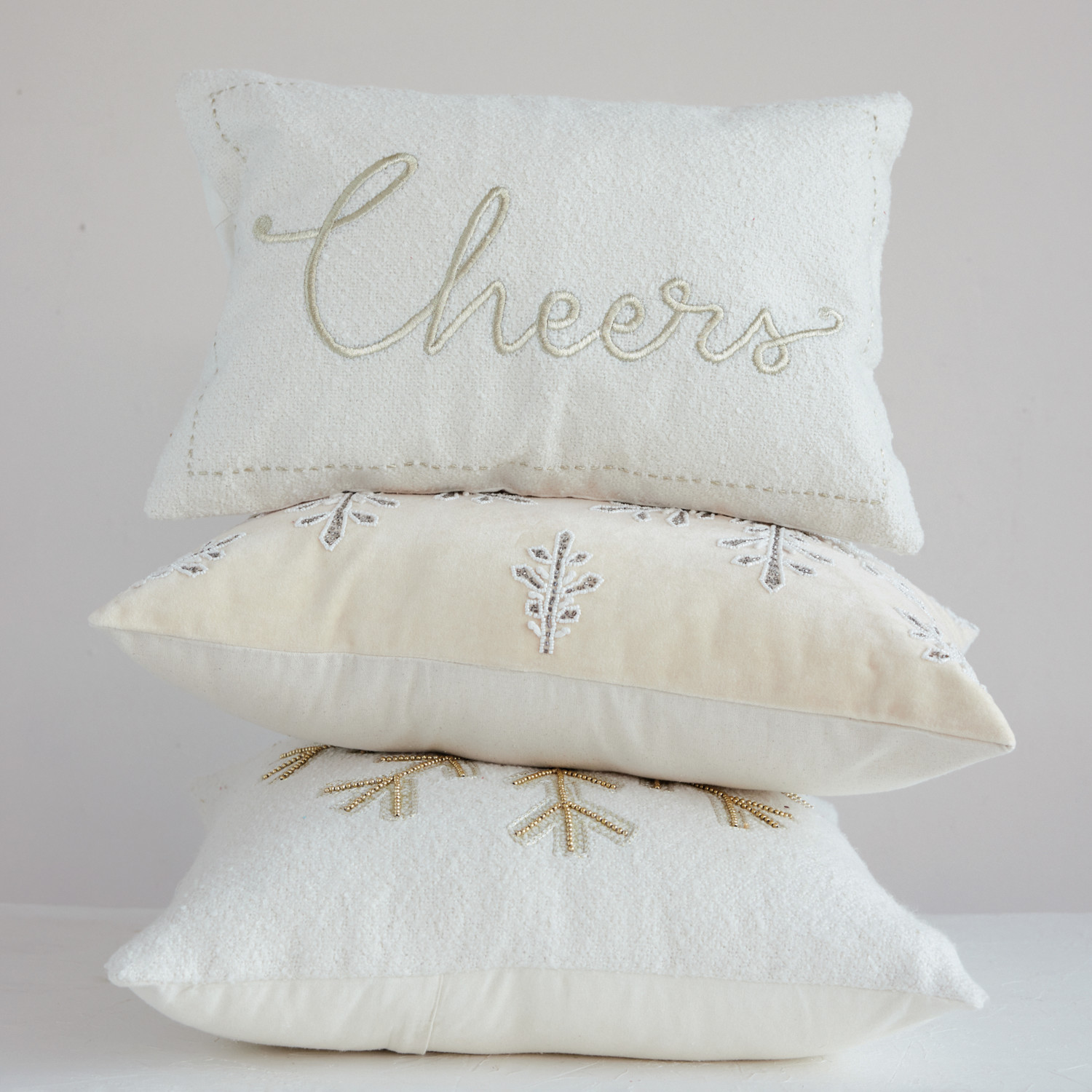 Catalog Name: 18" Square Cotton Bouclé Pillow w/ Embroidered Snowflake & Beads, Cream & Gold Color