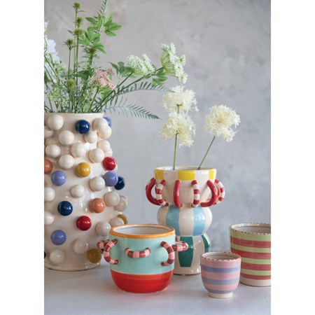 Catalog Name: 6" Round x 7"H Hand-Painted Ribbed Crock w/ Plaid Pattern & Bow, Multi Color (Each One Will Vary)