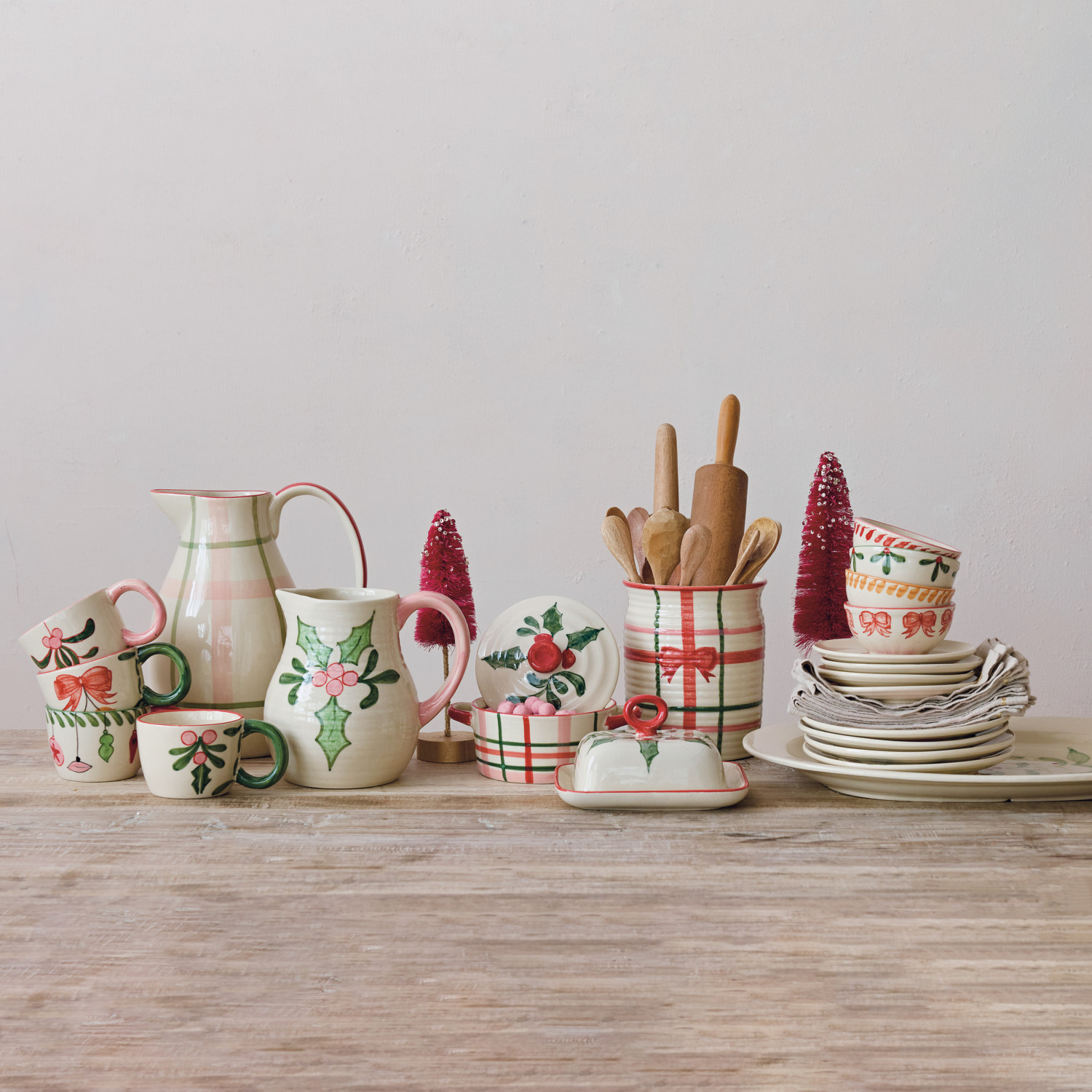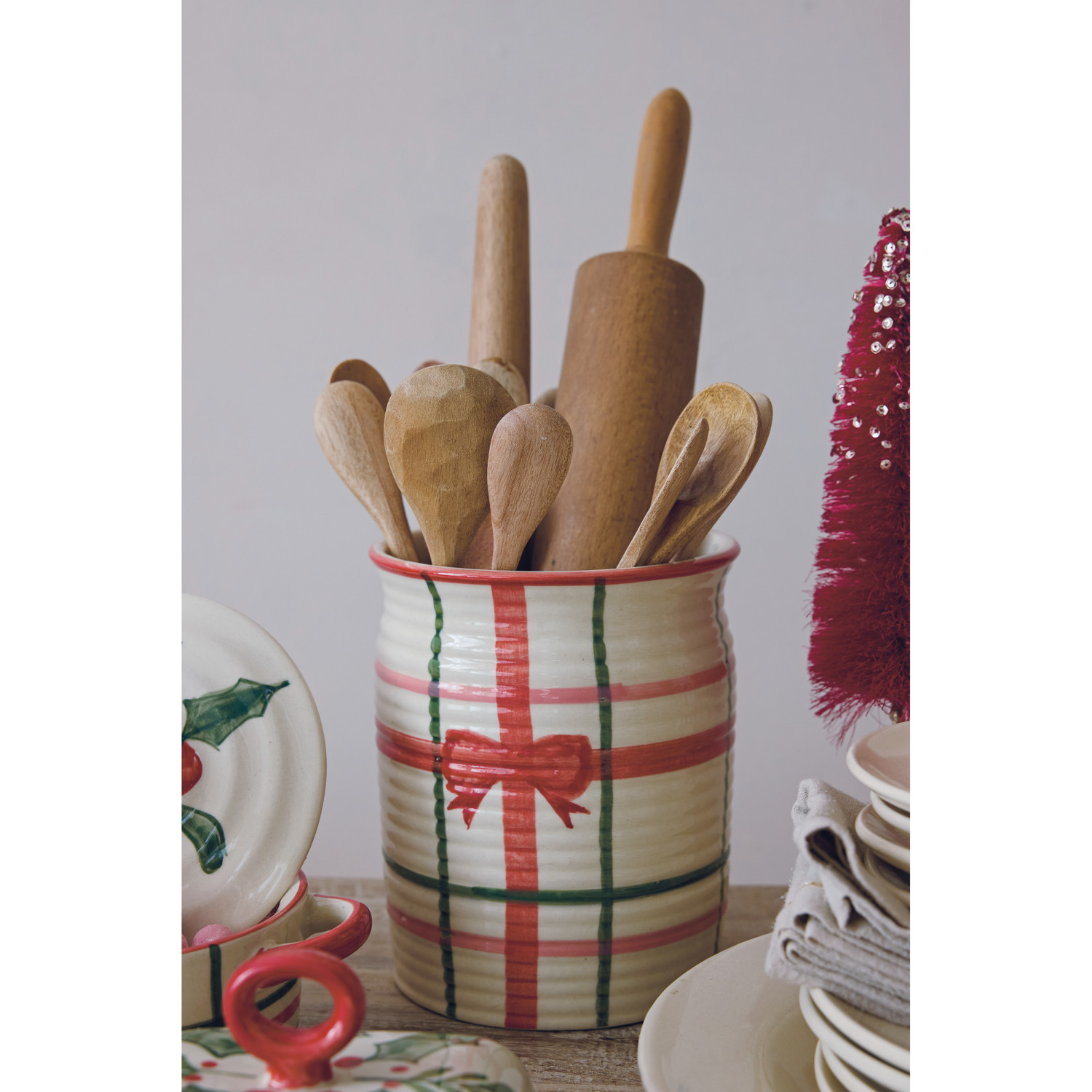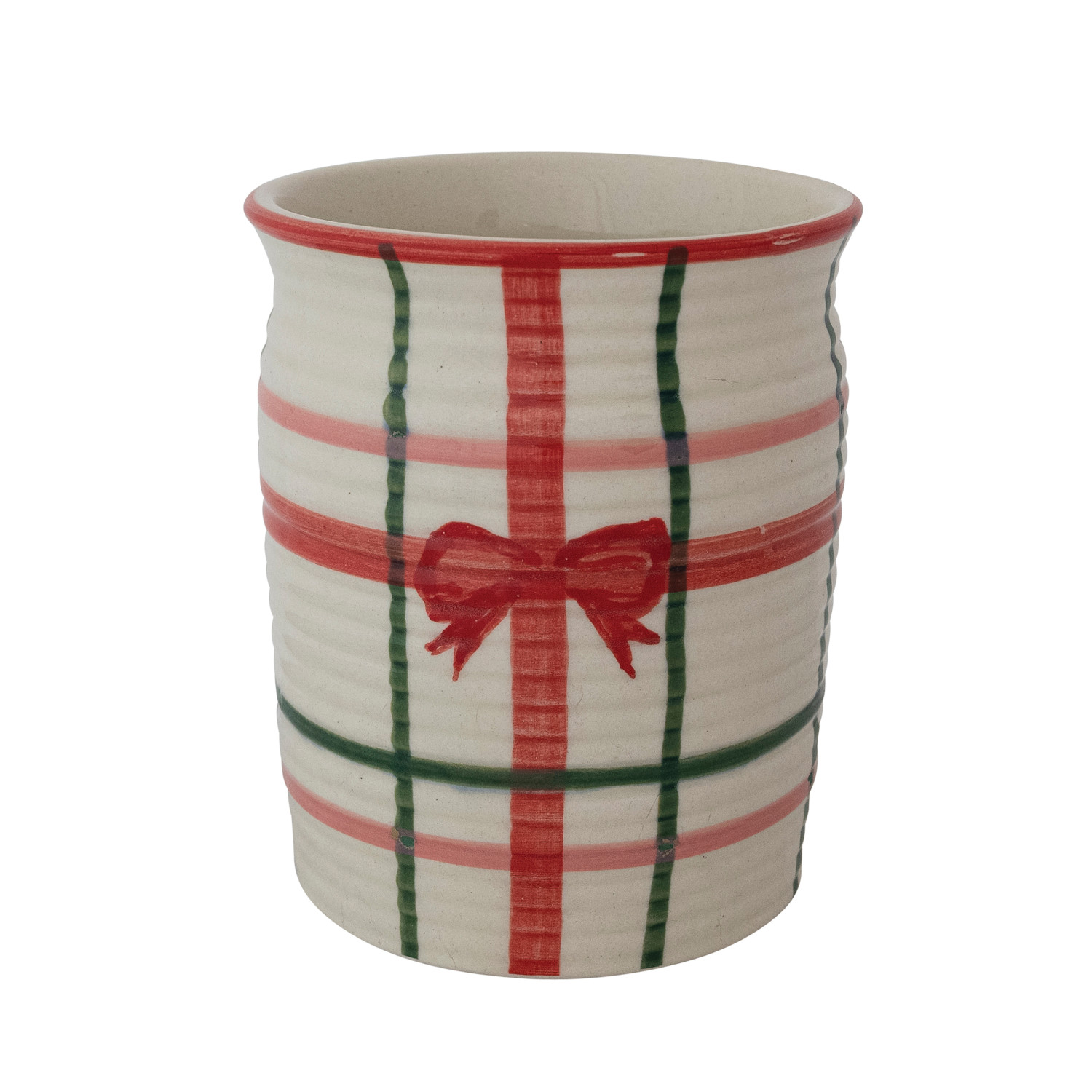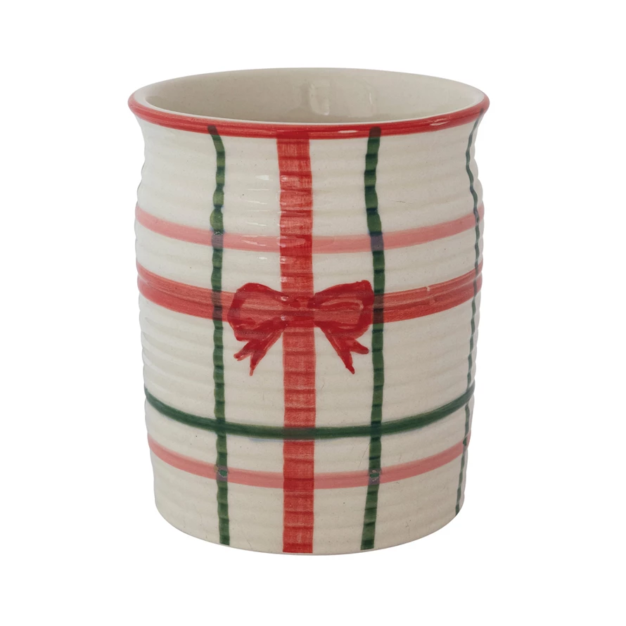 Hand-Painted Ribbed Crock with Plaid Pattern & Bow (Each One Will Vary)