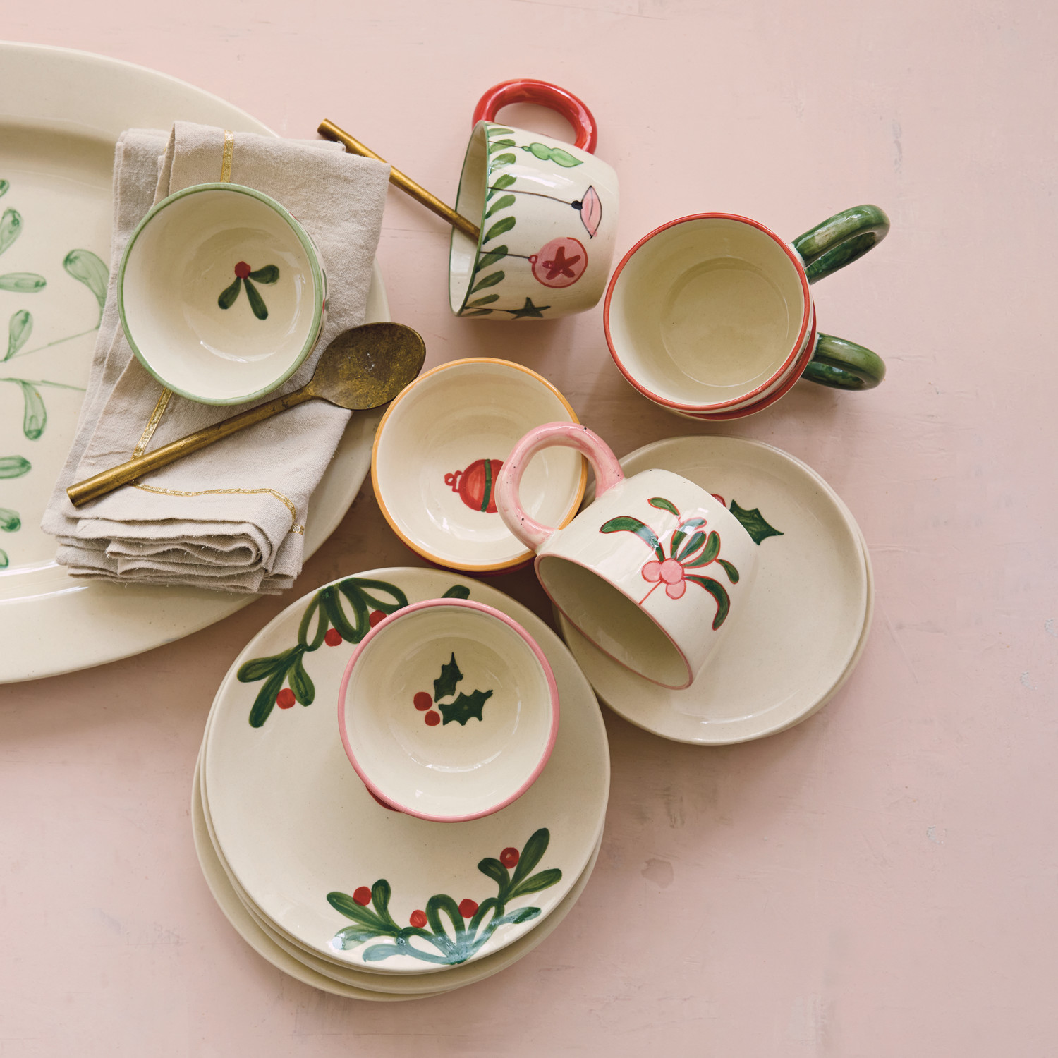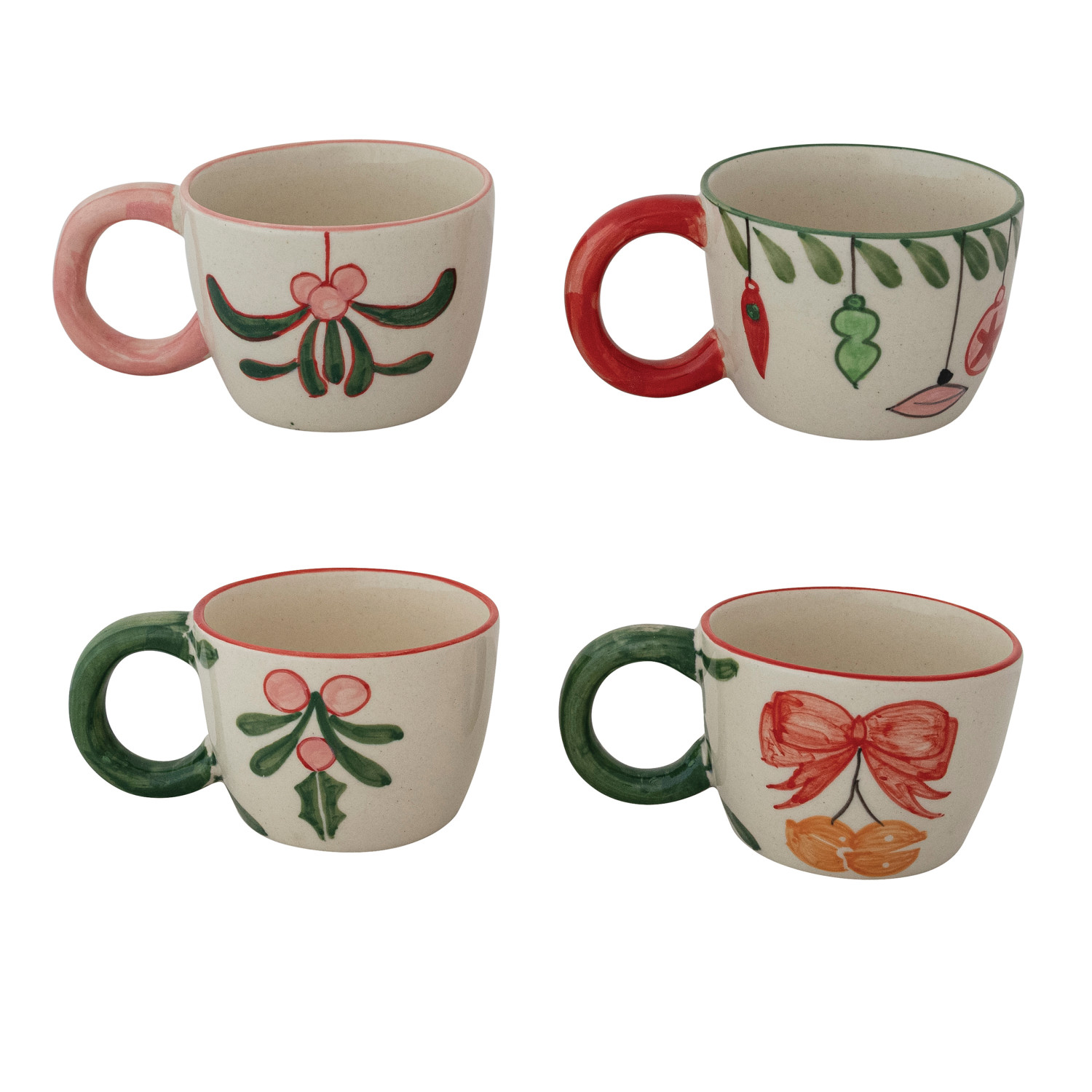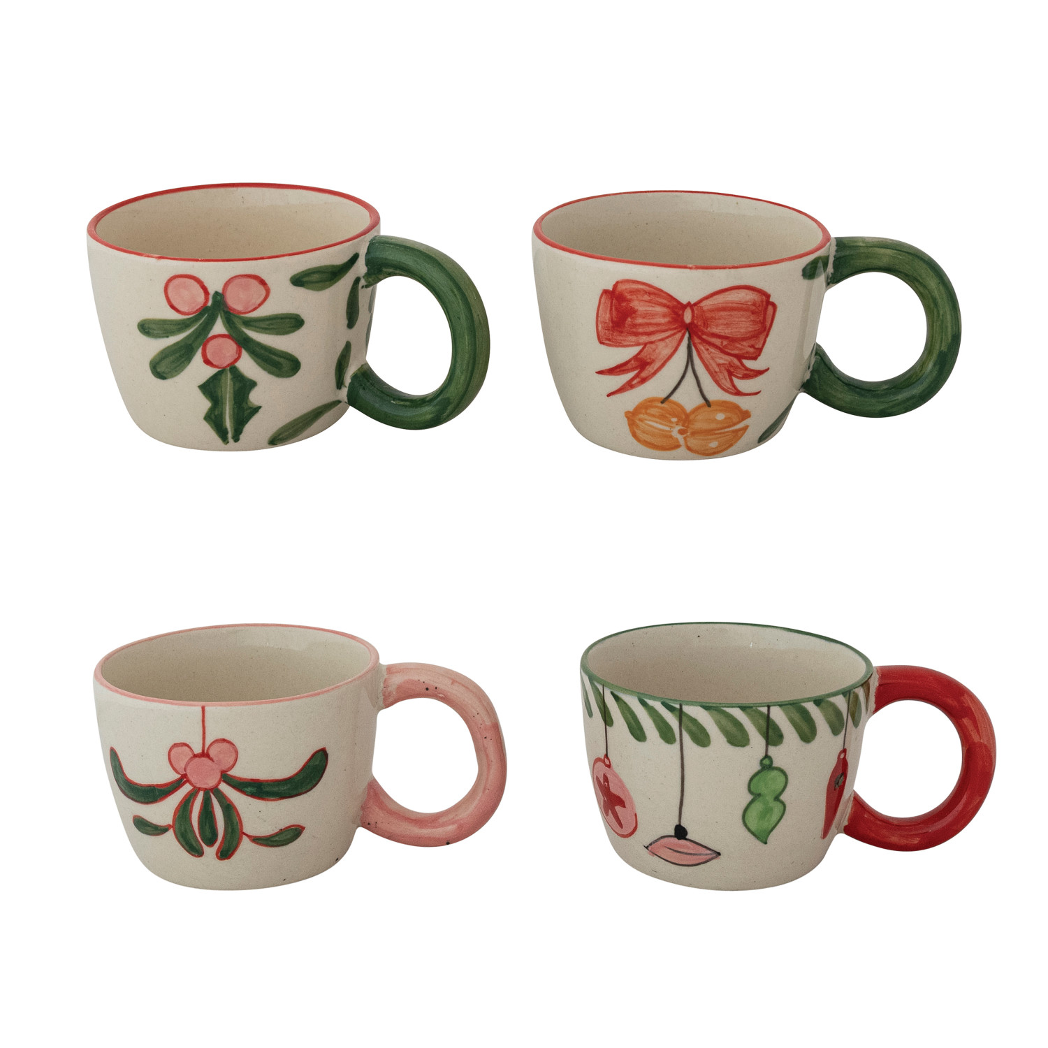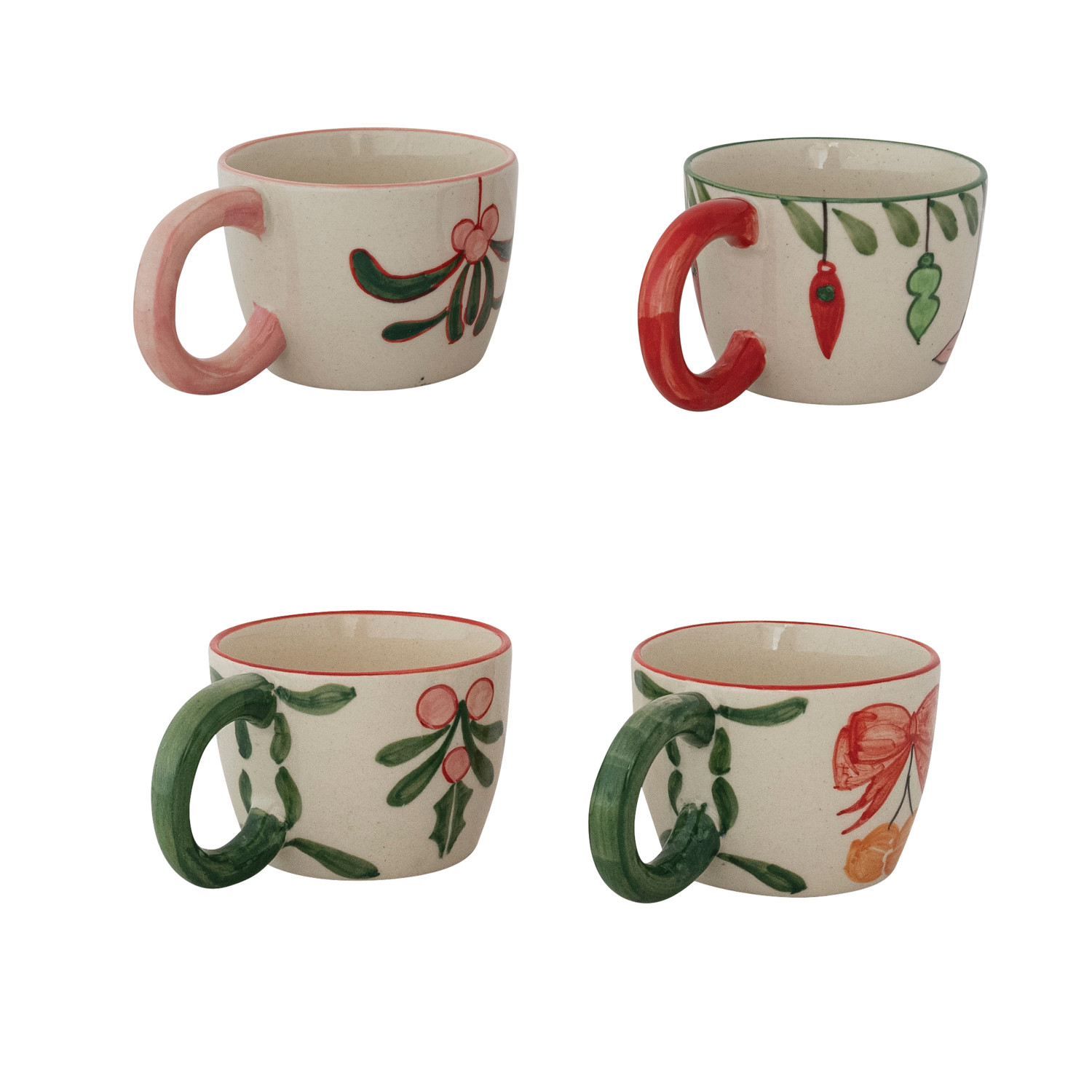 Catalog Name: 3-3/4" Round x 2-3/4"H 8 oz. Hand-Painted Stoneware Mug w/ Holiday Botanicals/Images, Colored Rim & Handle, Multi Color, 4 Styles (Each One Will Vary)