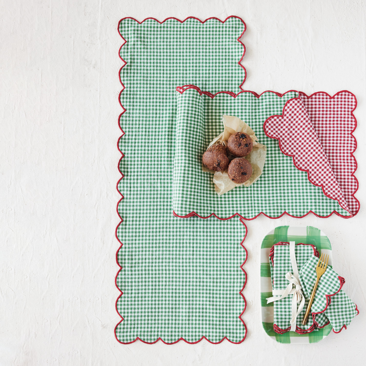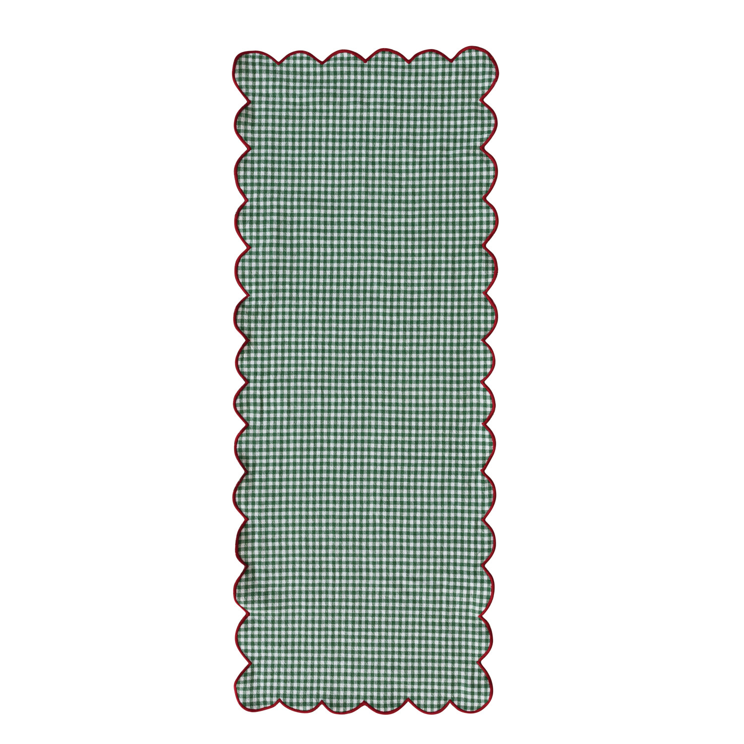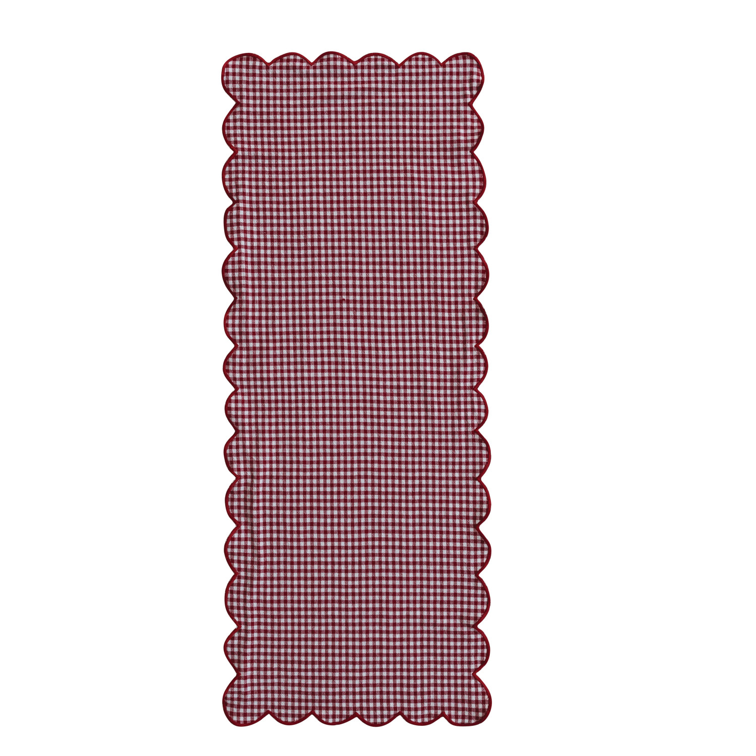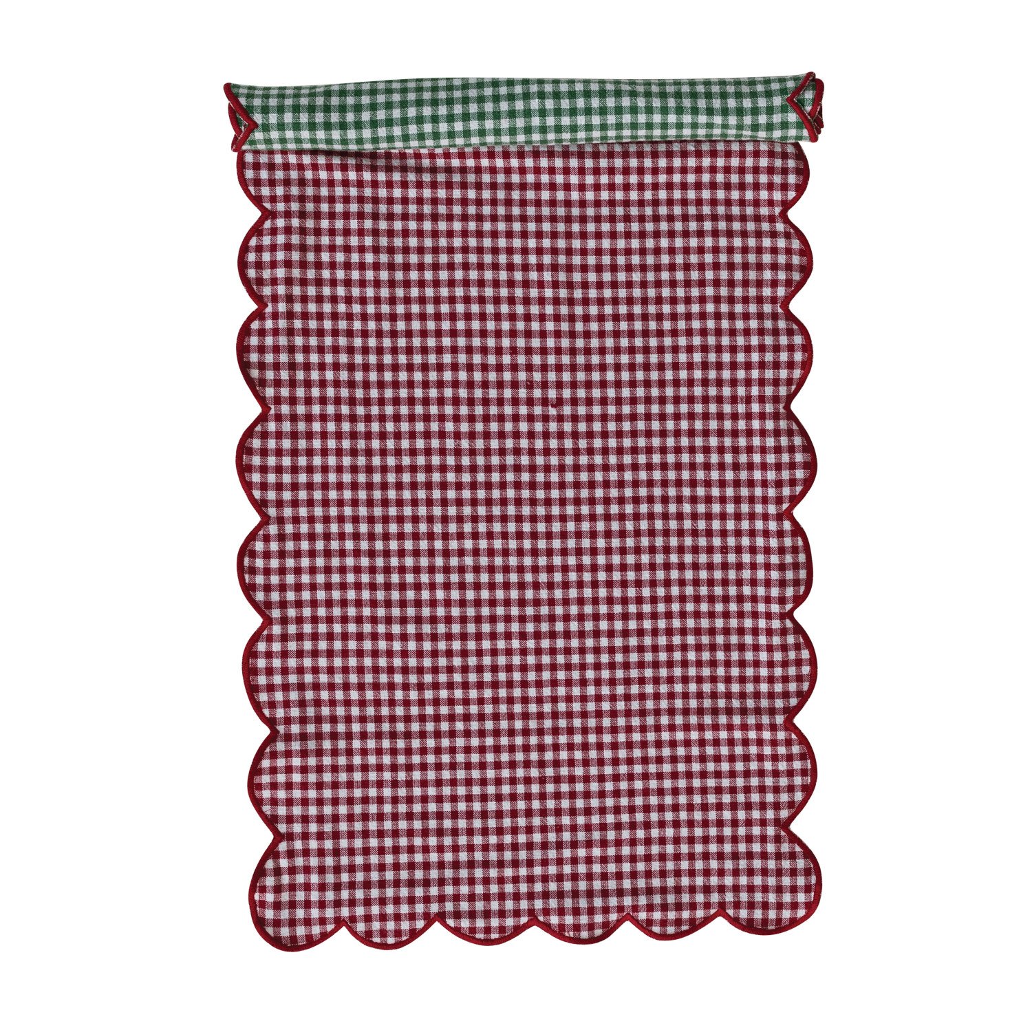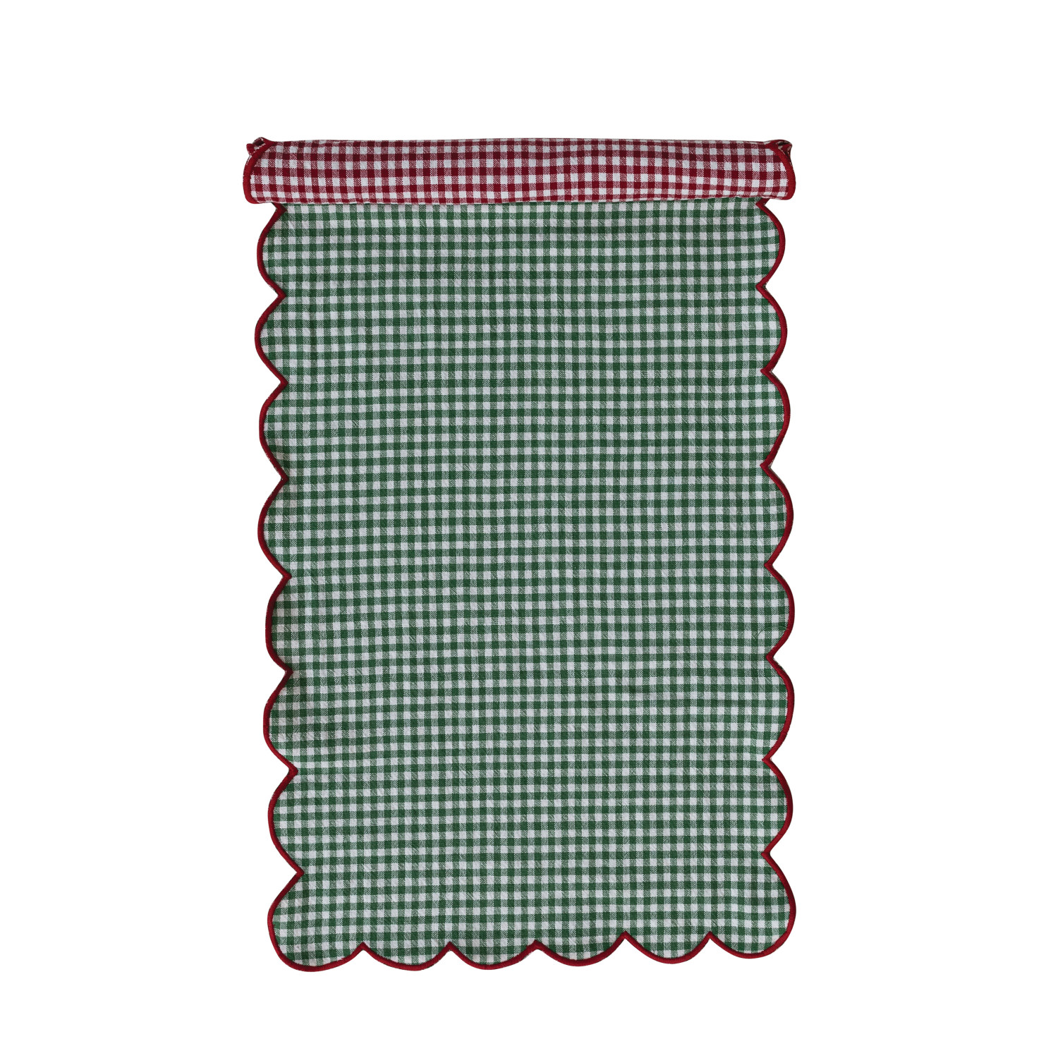 Catalog Name: 36"L x 14"W Woven Cotton Scalloped Two-Sided Table Runner w/ Gingham Pattern & Contrasting Stitched Edge, Red, Green & White, Roll Tied w/ Cotton Tape