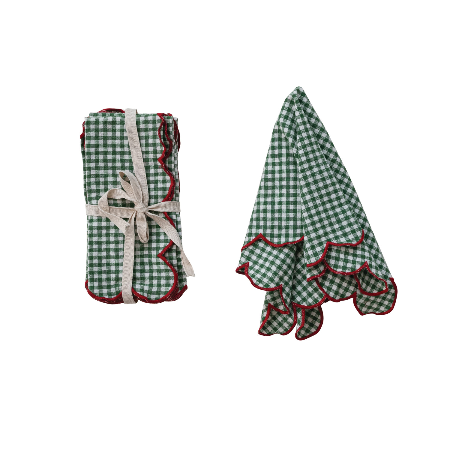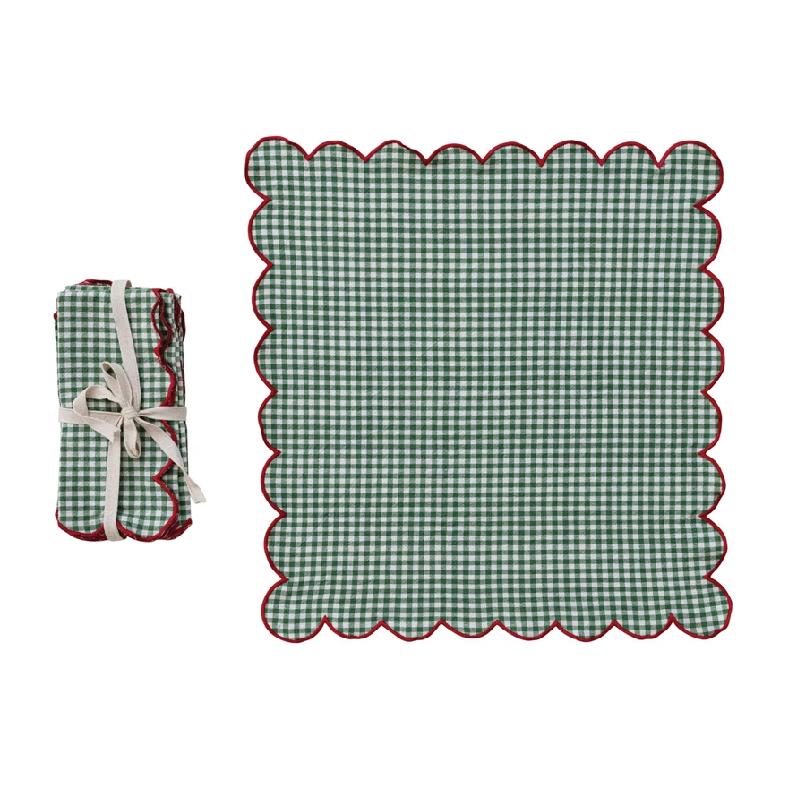 Catalog Name: 18" Square Cotton Scalloped Napkins w/ Gingham Pattern & Contrasting Stitched Edge, Green, White & Red, Set of 4 Tied w/ Cotton Tape