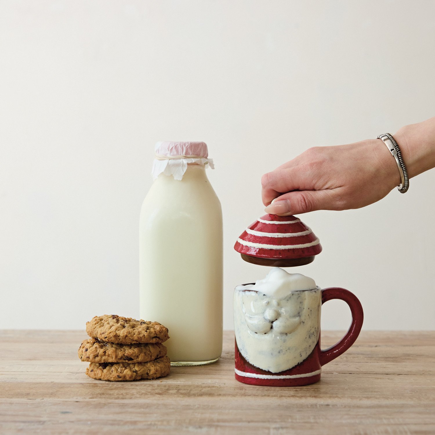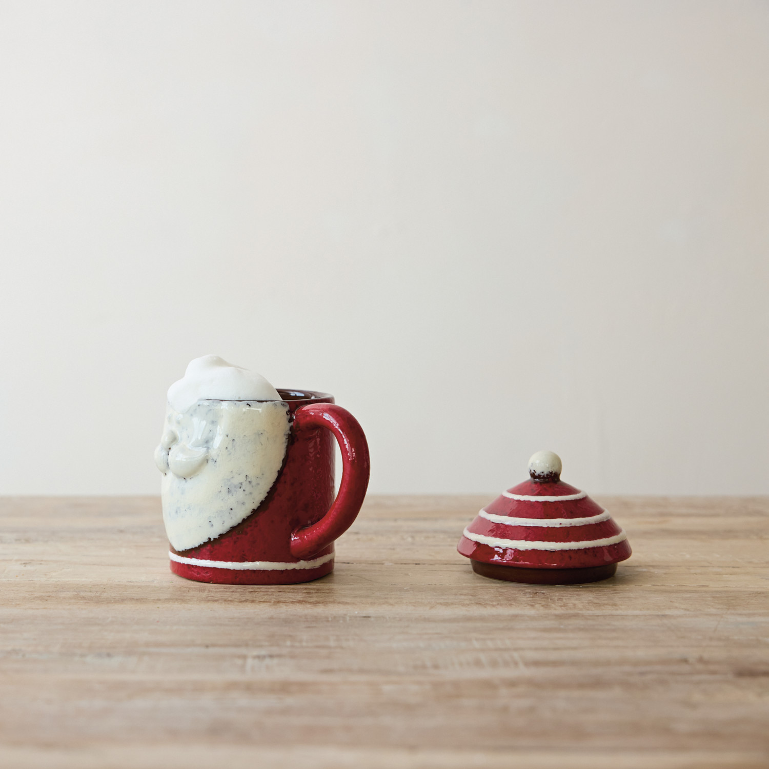 Catalog Name: 3-1/2" Round x 5-1/2"H 12 oz. Hand-Painted Ceramic Santa Head Shaped Mug w/ Hat Shaped Lid, Reactive Glaze, White & Red (Each One Will Vary)