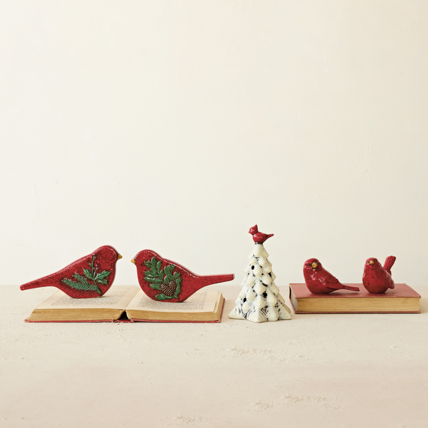 Catalog Name: 6"L x 2-3/4"H Hand-Painted Embossed Ceramic Bird w/ Botanical, Reactive Glaze, Red & Green/Brown, 2 Styles (Each One Will Vary)