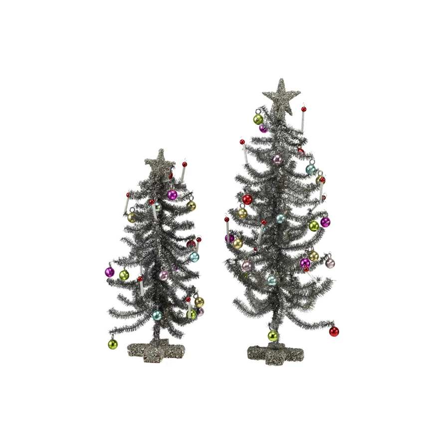 Tinsel & MDF Vintage Reproduction Trees with Ornaments & Glitter Star/Base, Set of 2