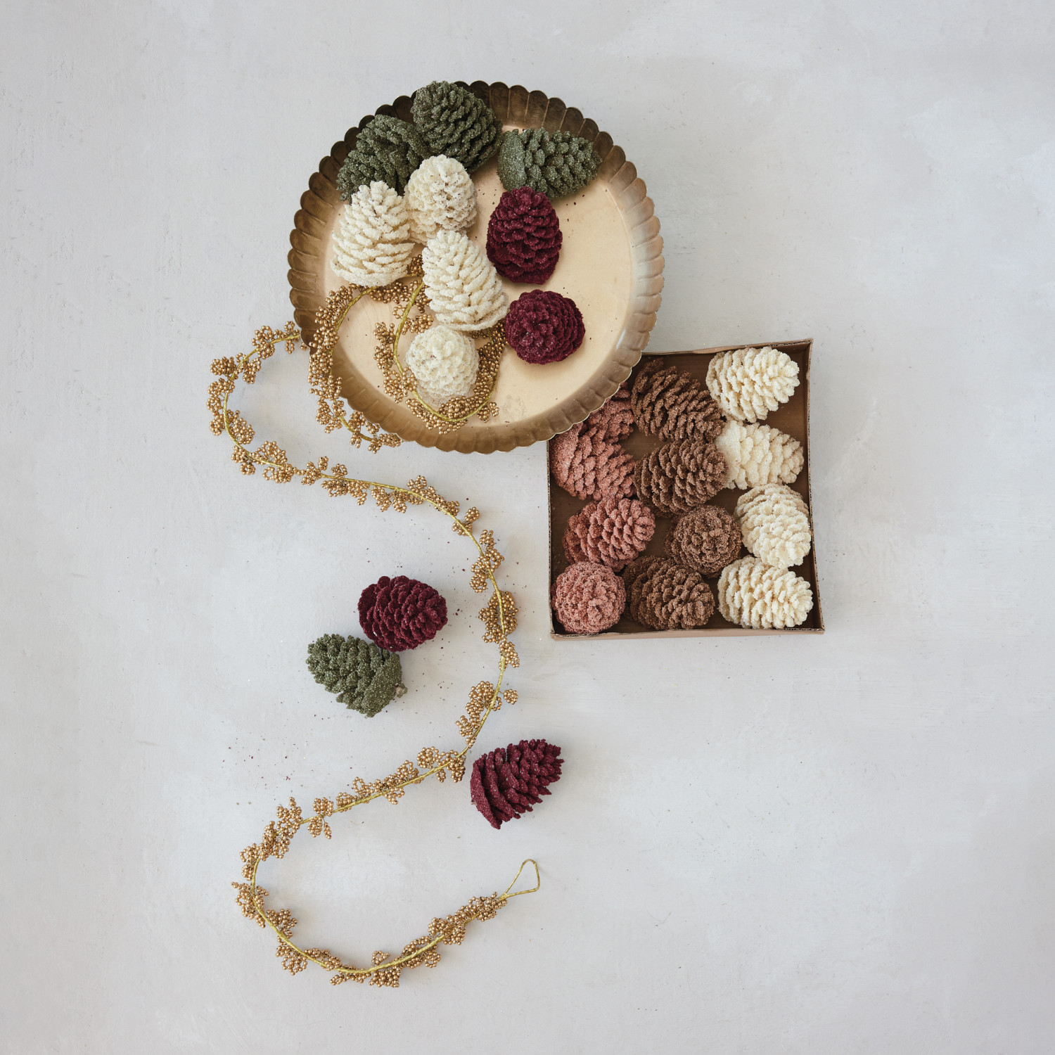 Catalog Name: 4" Round x 5"H Faux Pinecones w/ Glitter, Burgundy, Green & Cream Color, Boxed Set of 9