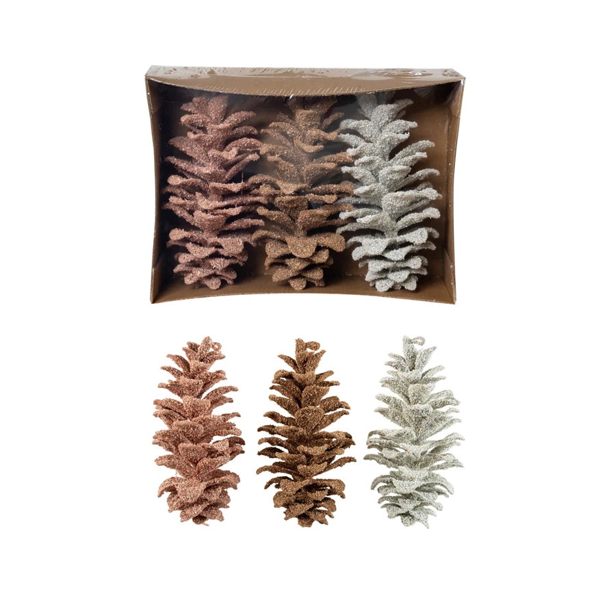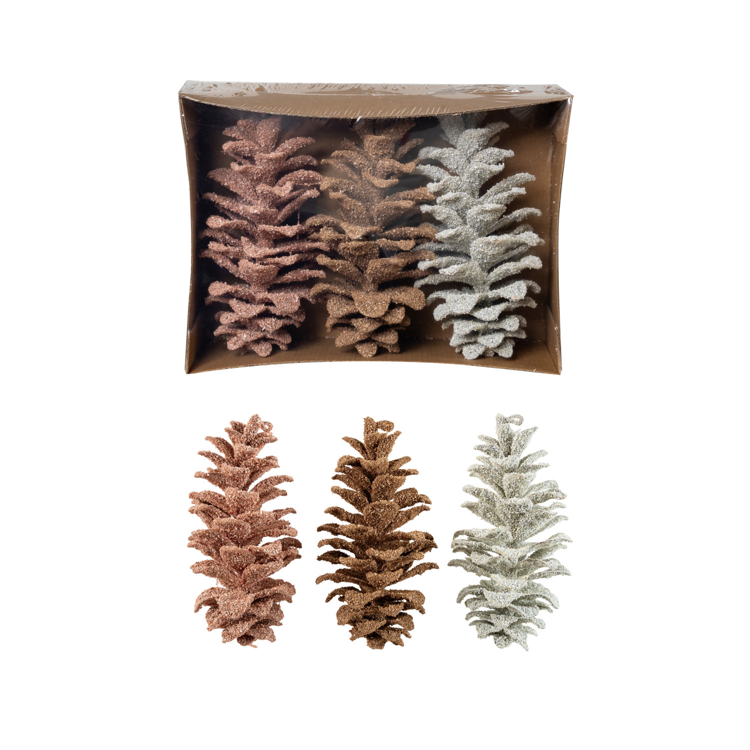 Catalog Name: 4" Round x 8"H Faux Pinecones w/ Glitter, Pink, Brown & White, Boxed Set of 3