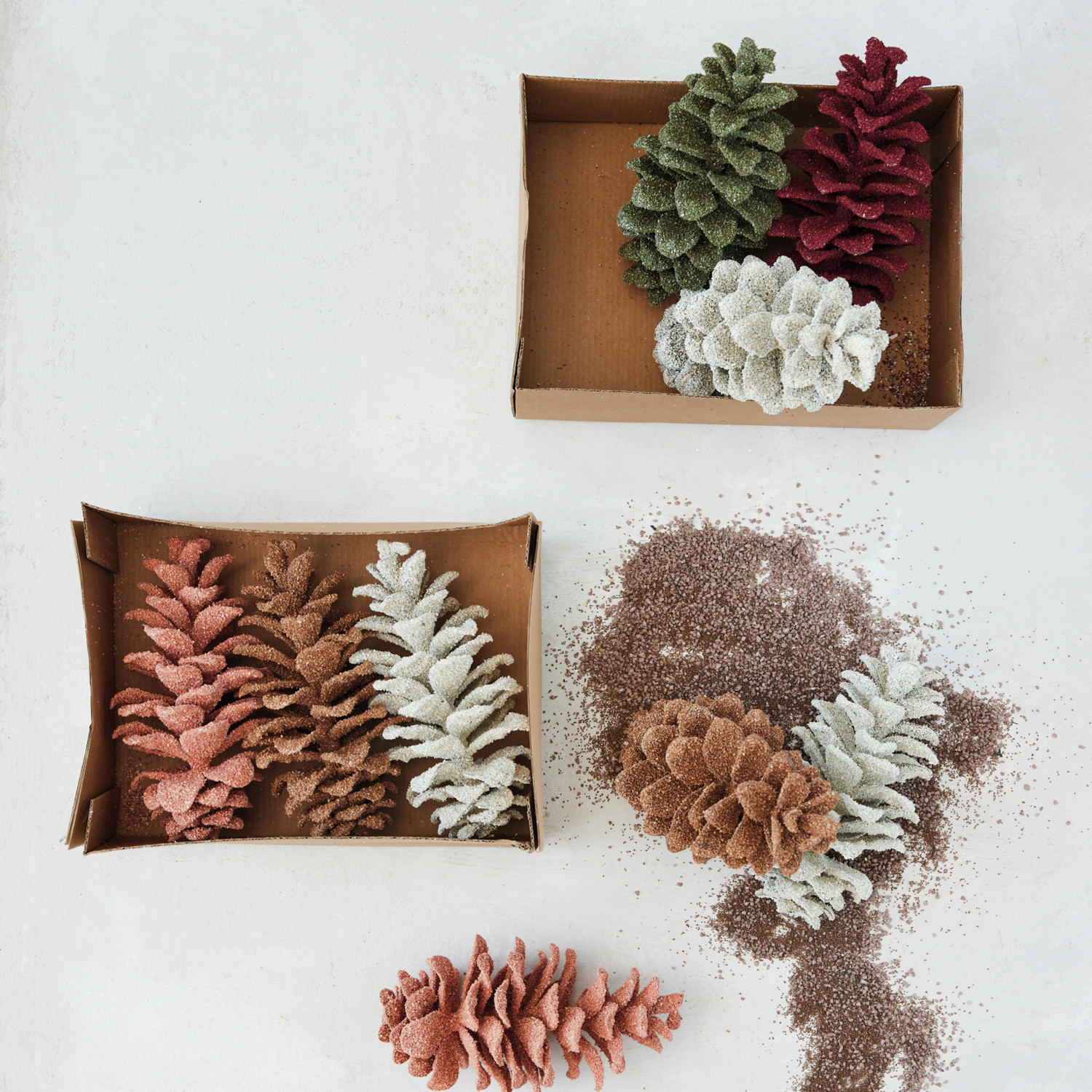 Faux Pinecones with Glitter, Pink, Brown & White, Boxed Set of 3