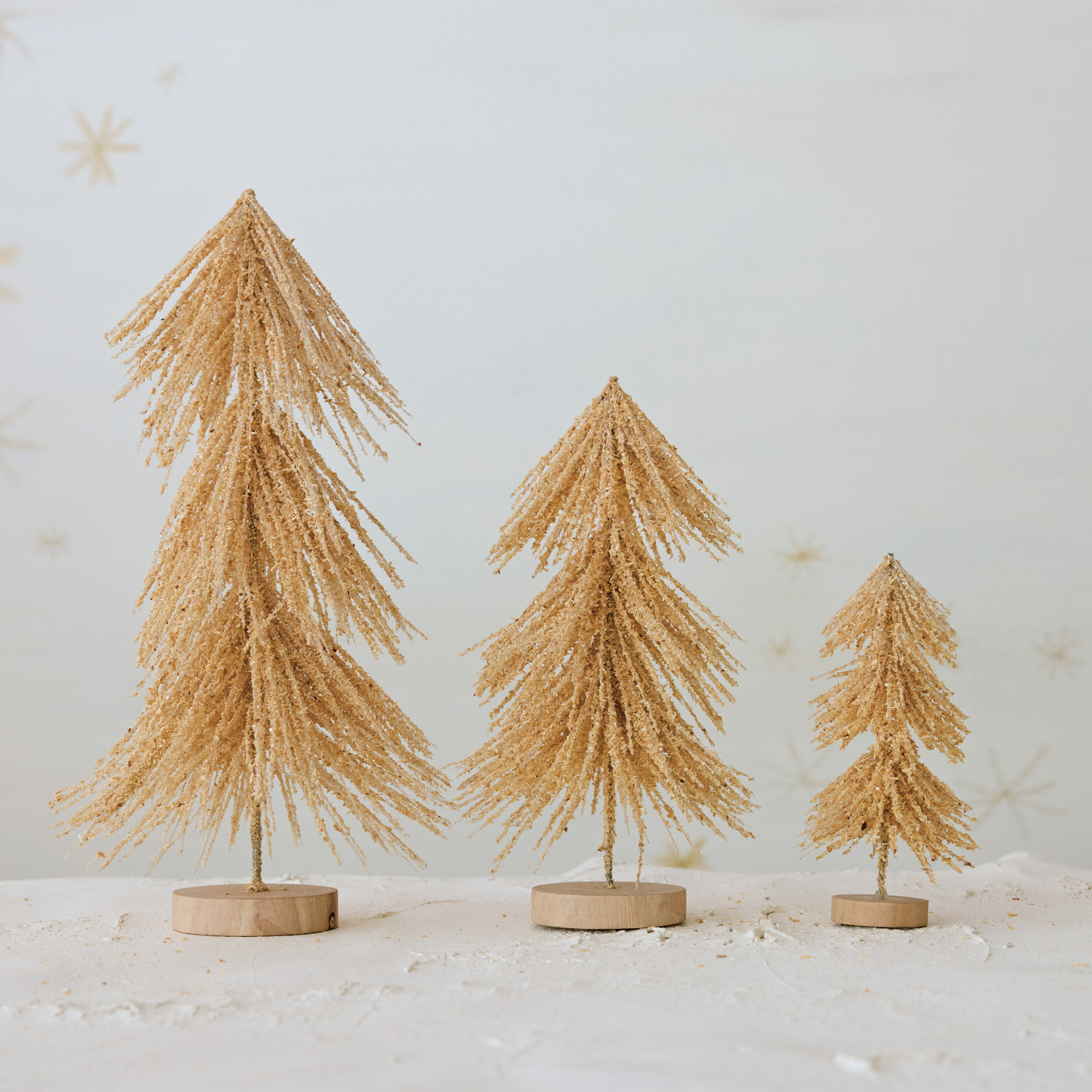 Flocked Plastic Bottle Brush Trees with Sugar & Wood Bases, Tan Color, Set of 3