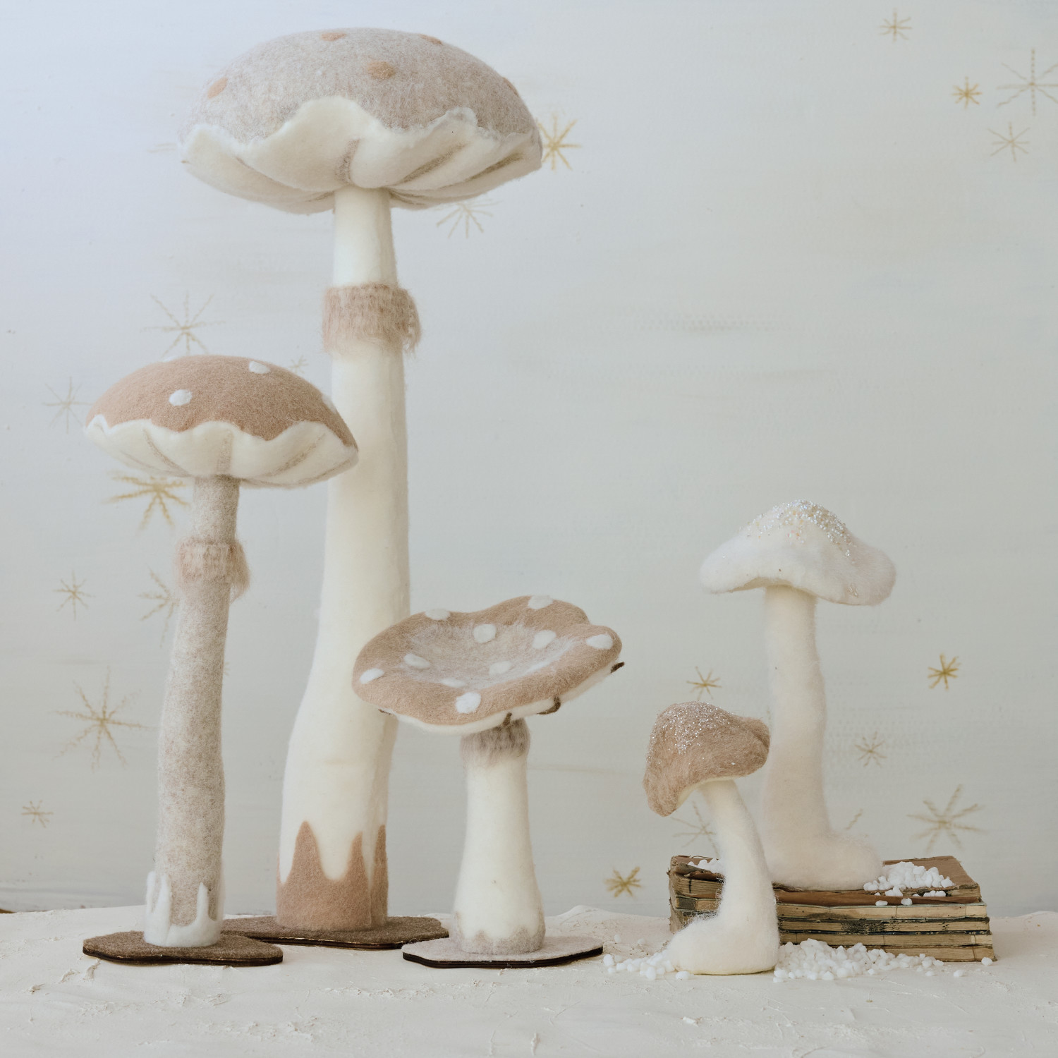 Catalog Name: 6-1/4" Round x 13"H Foam & Fabric Mushroom w/ Glitter & Base, Cream Color