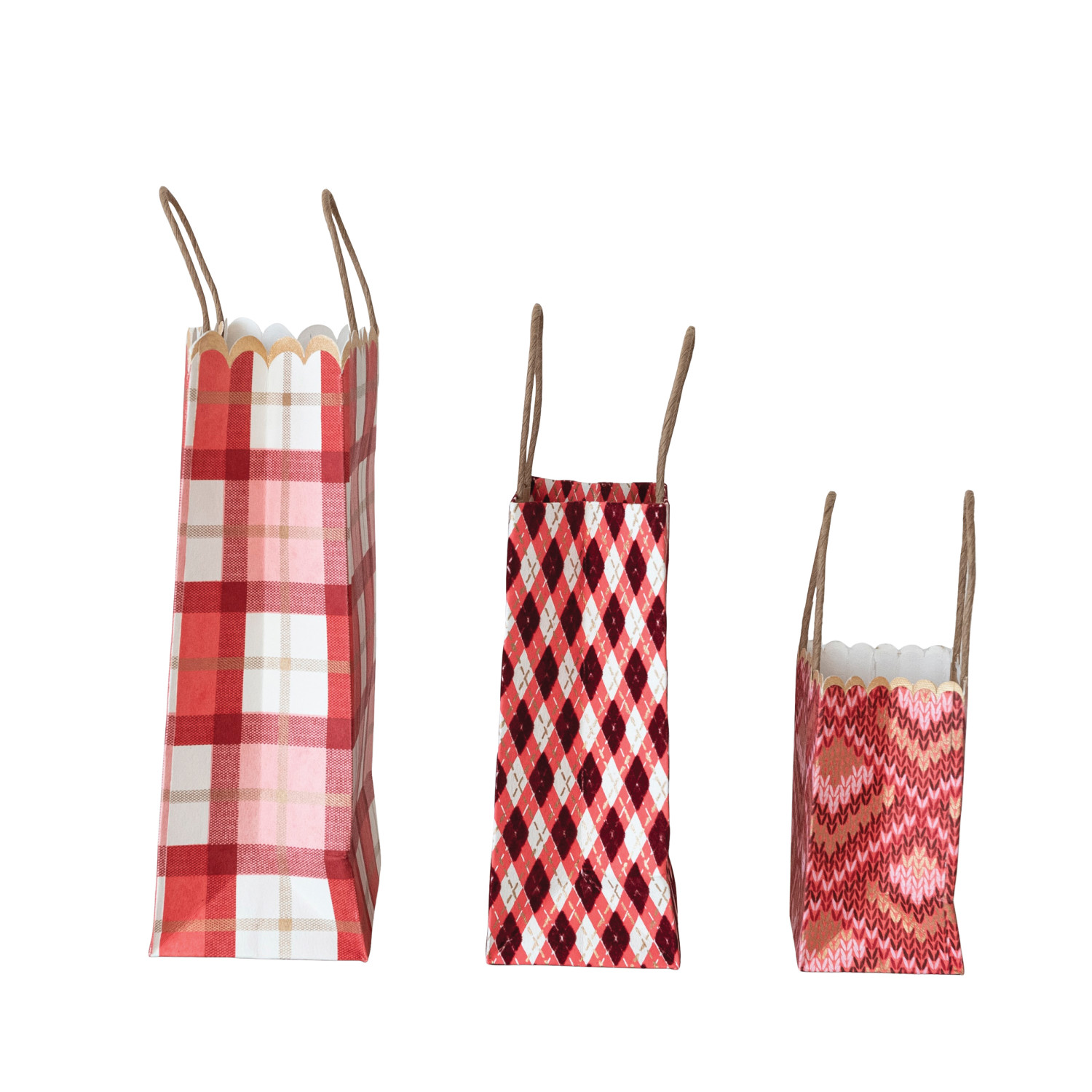 Catalog Name: 9"L x 4"W x 11-1/2"H, 6-1/2"L x 3-1/2"W x 8-1/2"H & 5"L x 3"W x 5-1/2"H Handmade Printed Scalloped Recycled Paper Gift Bags w/ Patterns, Multi Color, Set of 3