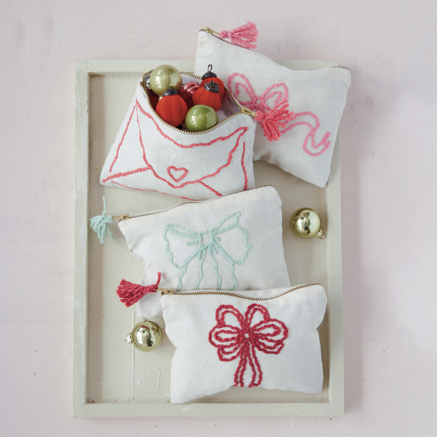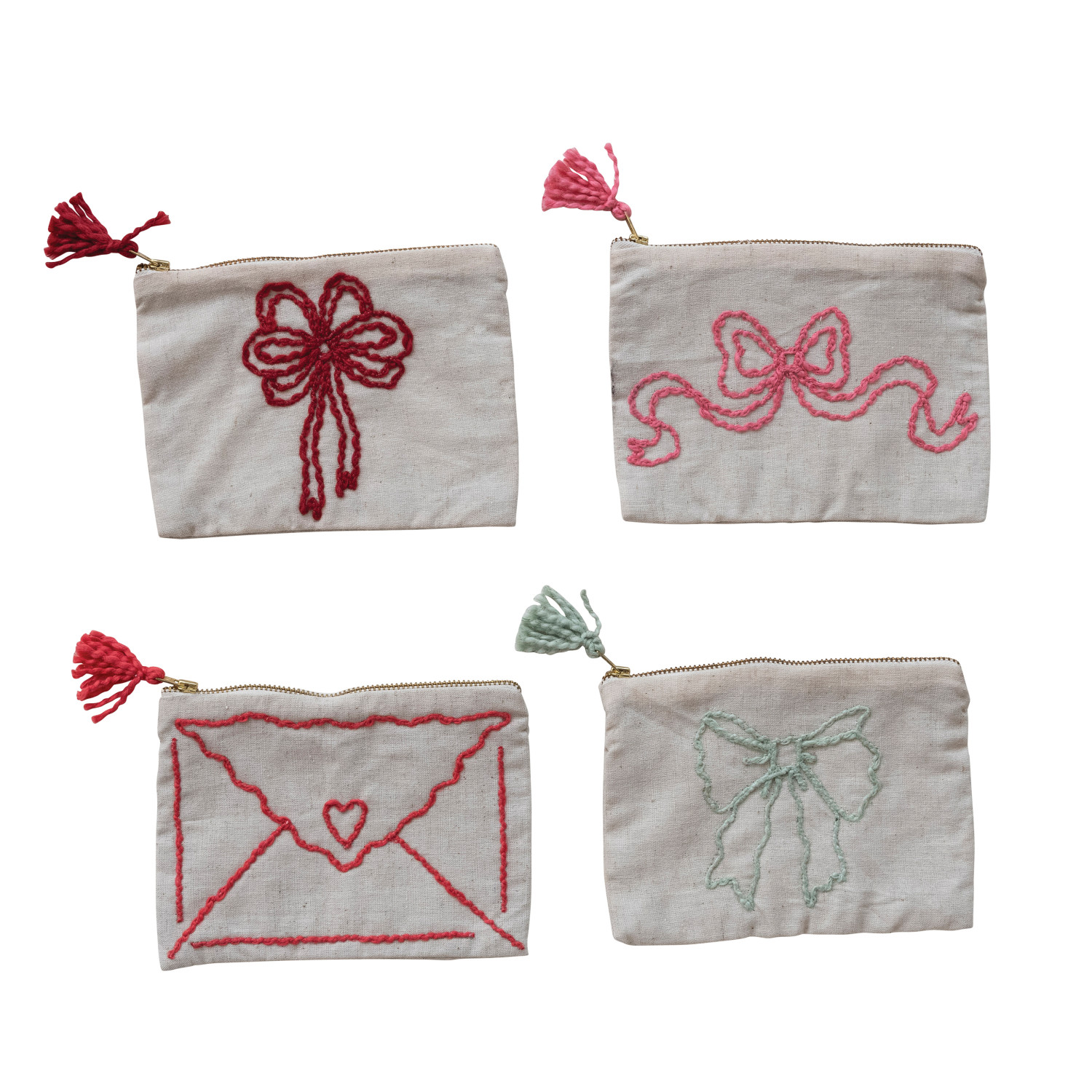 Cotton & Linen Zip Pouch with Embroidered Letter & Tassel, 4 Styles