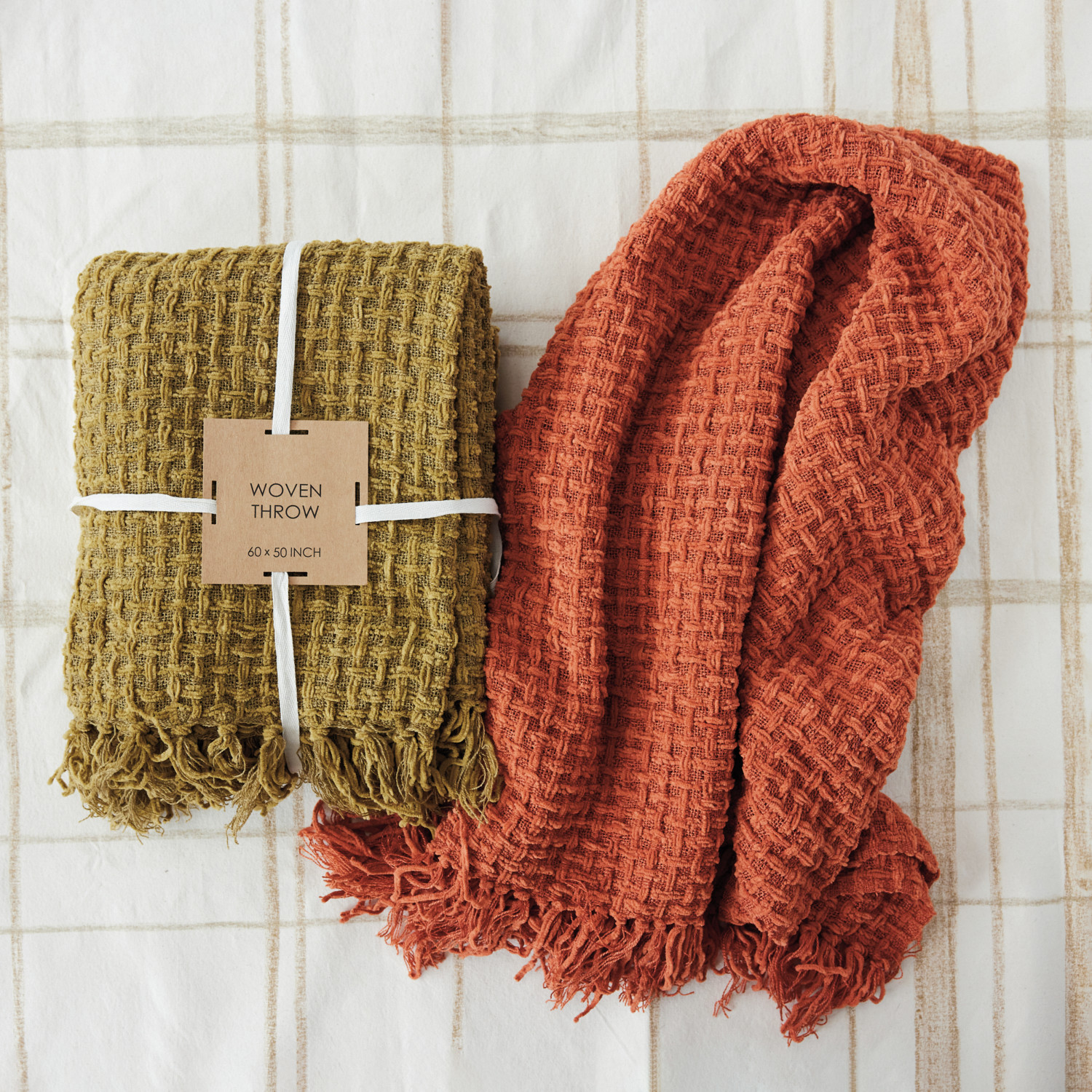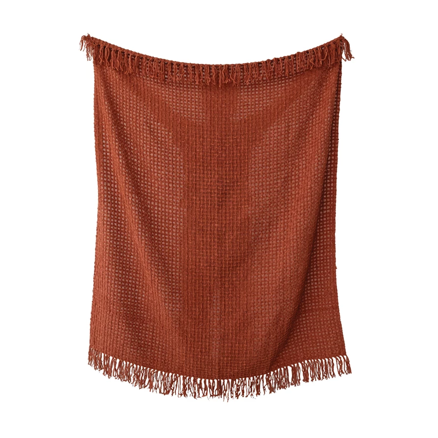 Woven Fabric Chenille Waffle Weave Throw with Fringe, Rust Color