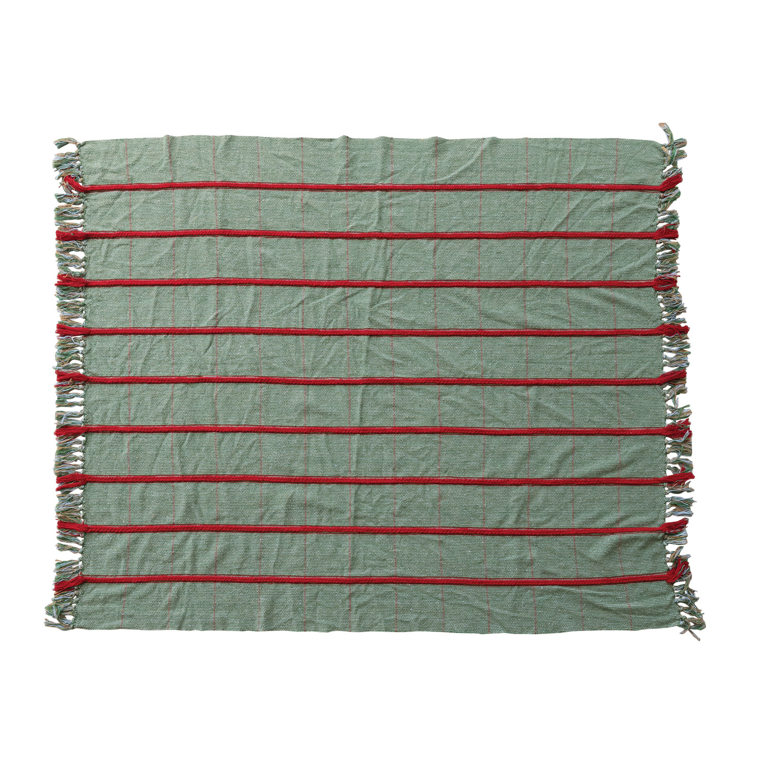 Catalog Name: 60"L x 50"W Woven Recycled Blend Throw w/ Braided Embroidery, Grid Pattern & Fringe, Green & Red