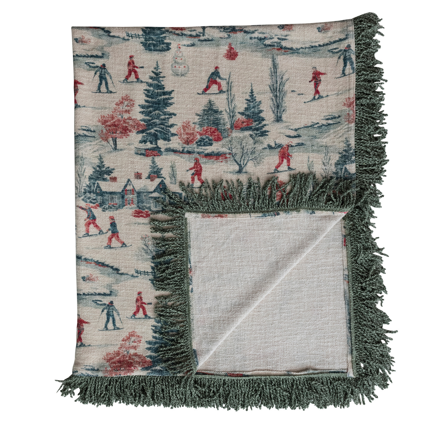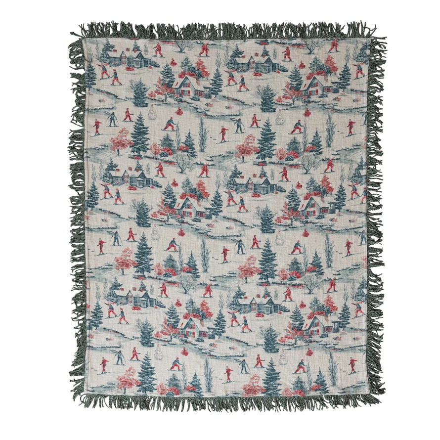 Cotton Slub Printed Throw with Ski Scene & Bullion Fringe