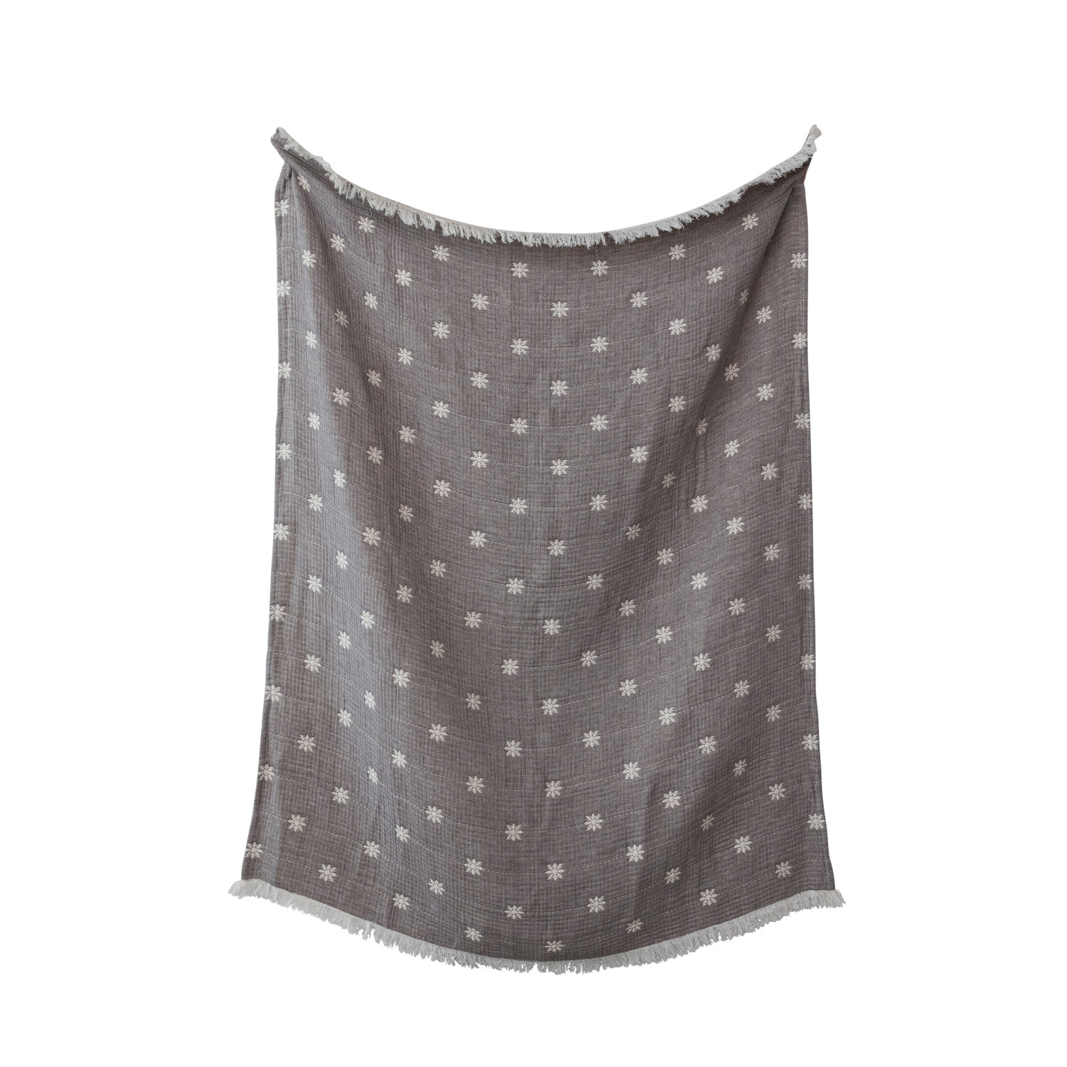 Catalog Name: 60"L x 50"W Cotton Double Cloth Throw w/ Snowflakes, Eyelash Fringe & Hand-Embroidered Kantha Stitch, Grey & Natural