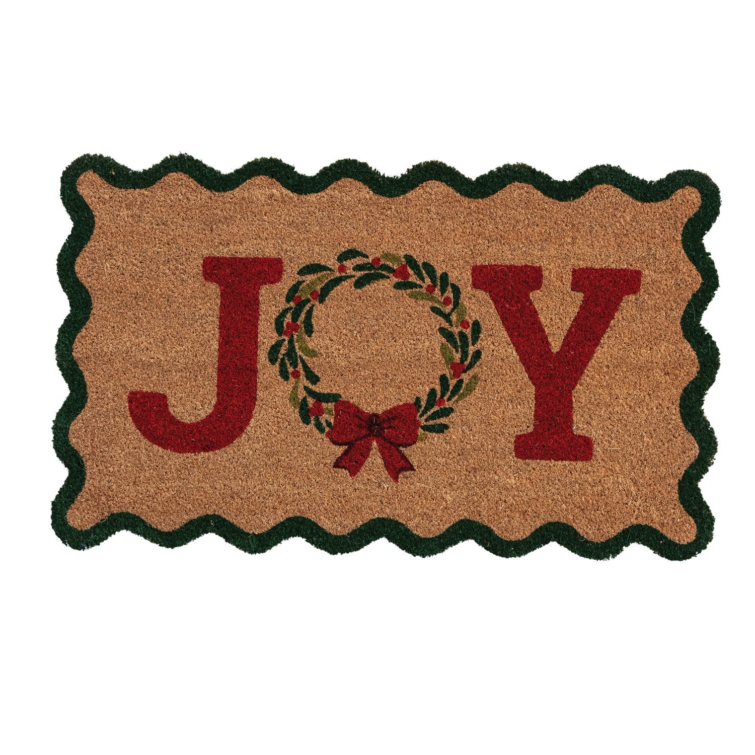 Catalog Name: 30"L x 18"W Natural Coir Scalloped Doormat w/ Wreath & Bow "JOY", Multi Color