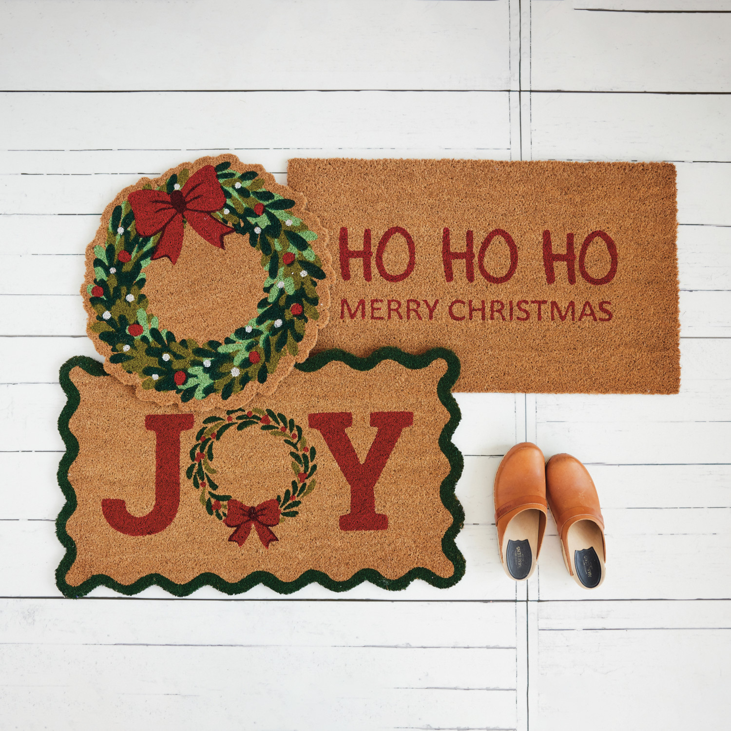 Catalog Name: 19-1/2" Round Natural Coir Wreath Shaped Doormat w/ Bow, Green, Red & White