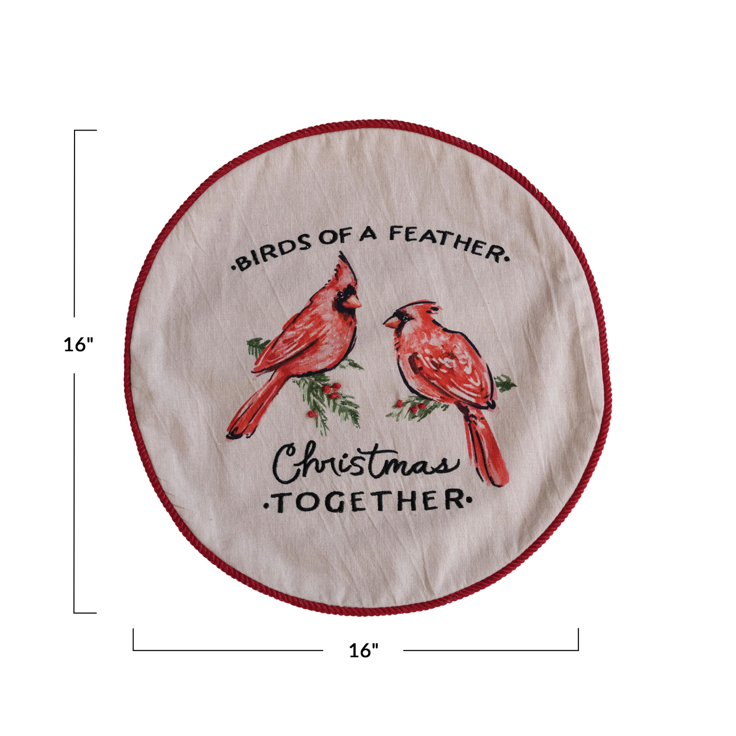 This corduroy-backed cotton pillow is a celebration of holiday companionship, featuring a printed and embroidered design of cardinals that symbolize joy and togetherness. The phrase "Birds Of A Feather, Christmas Together" frames the scene, set against a backdrop of multicolored cotton fabric. The corduroy back adds a touch of luxury and comfort, making it a perfect addition to any festive setting. With a diameter of 16 inches, it's the ideal size for adding a touch of holiday cheer to the home. The polyester fill ensures a plush feel, inviting everyone to relax and enjoy the season's greetings. Whether it's part of the Christmas tradition or a new addition to the decor, this pillow is sure to bring smiles and warmth to the celebrations. A delightful scene of cardinals, captured in vibrant print and embroidery, adorns this round cotton pillow, echoing the sentiment "Birds Of A Feather, Christmas Together". An ideal piece to bring festive warmth, it pairs perfectly with cozy throws and seasonal decor. A plush polyester fill gives this pillow a full, firm shape.