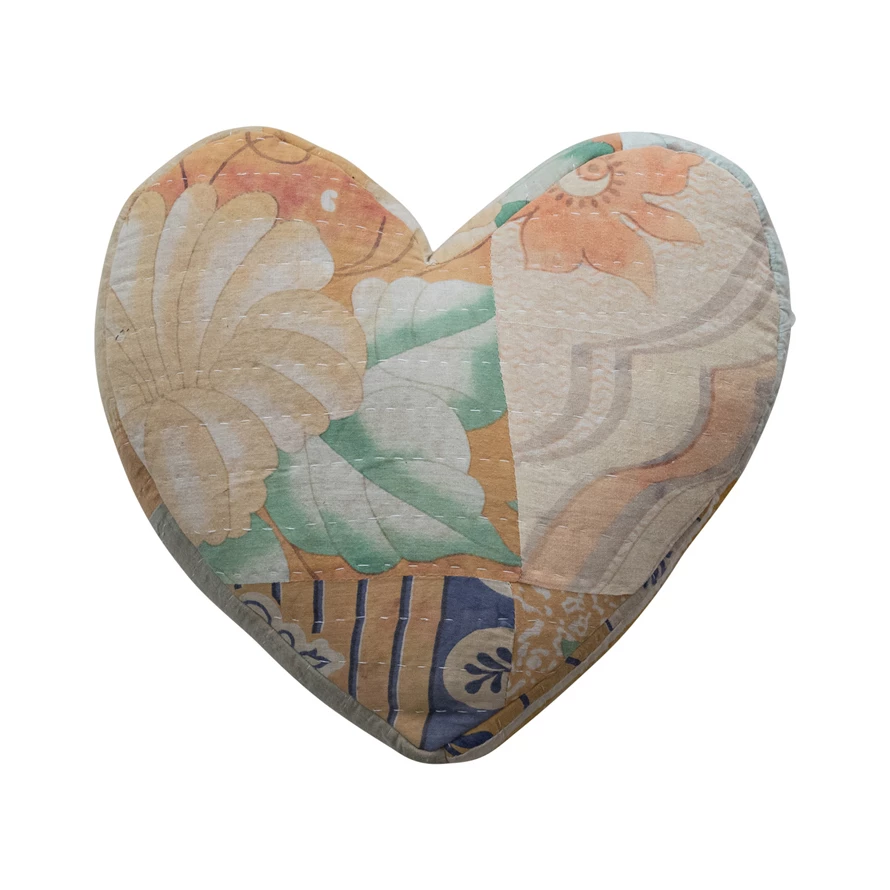 Catalog Name: 14"L x 14"H Vintage Heart Shaped Pillow w/ Hand-Embroidered Kantha Stitch, Bleached, Multi Color (Each One Will Vary)