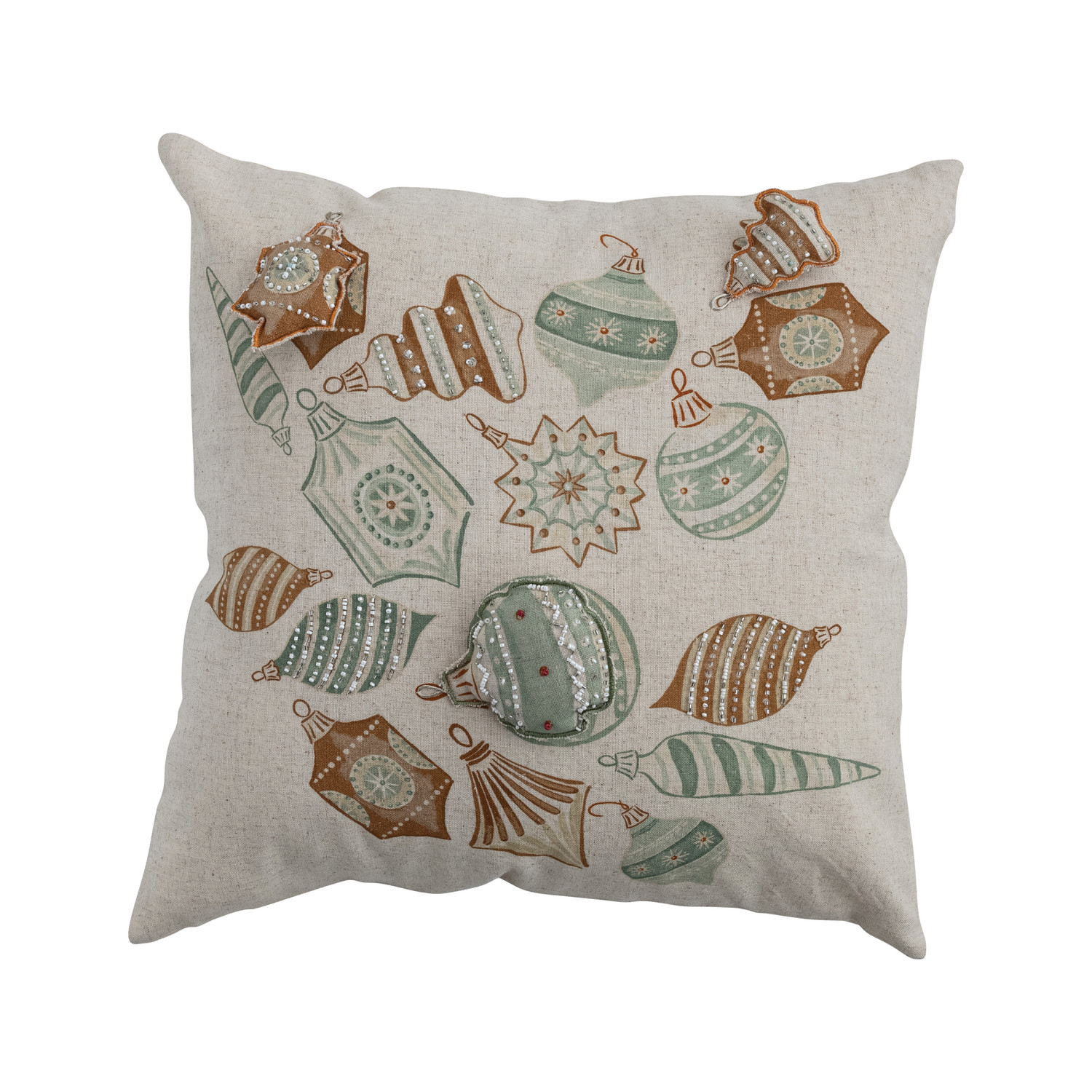 Catalog Name: 18" Square Cotton & Linen Printed Pillow w/ Holiday Ornament Pattern, Beads & 3D Ornaments, Multi Color ©