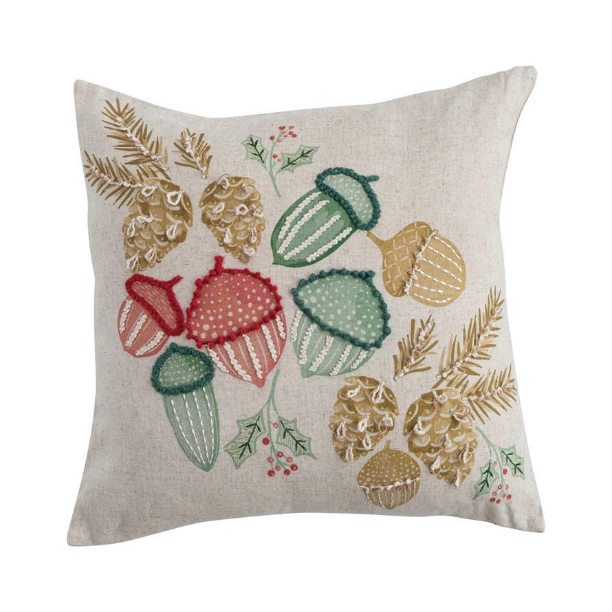 Catalog Name: 18" Square Cotton & Linen Printed Pillow w/ Embroidered Acorns, Multi Color ©