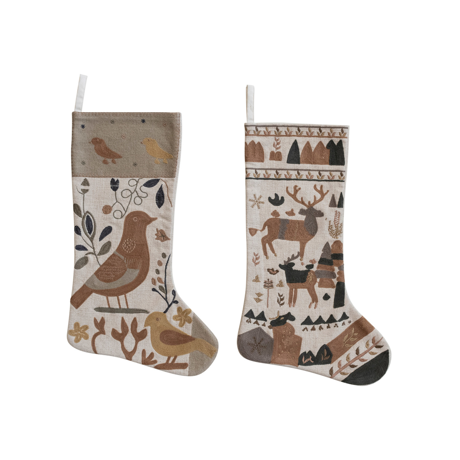 Catalog Name: 20"H Cotton & Linen Stocking w/ Embroidered Birds/Reindeer, Multi Color, 2 Styles