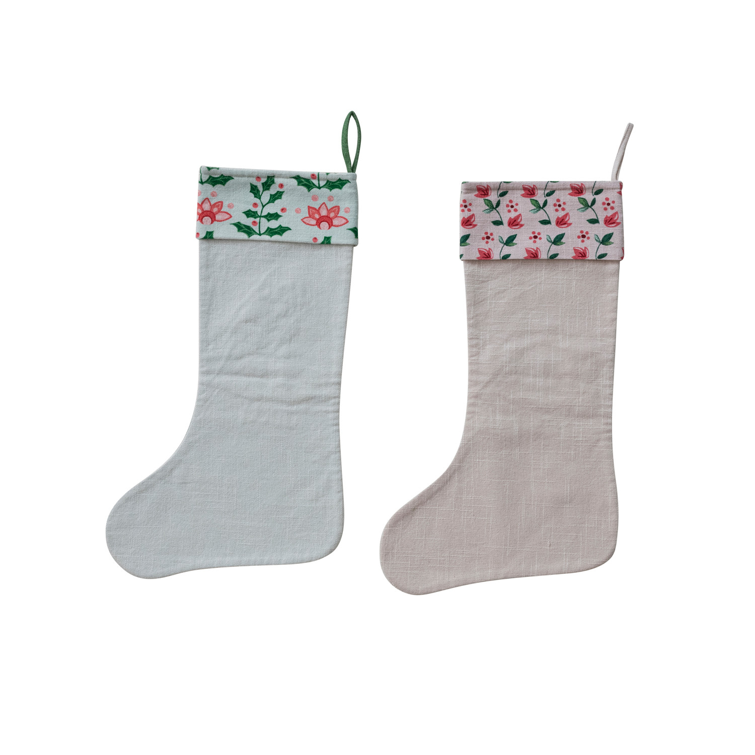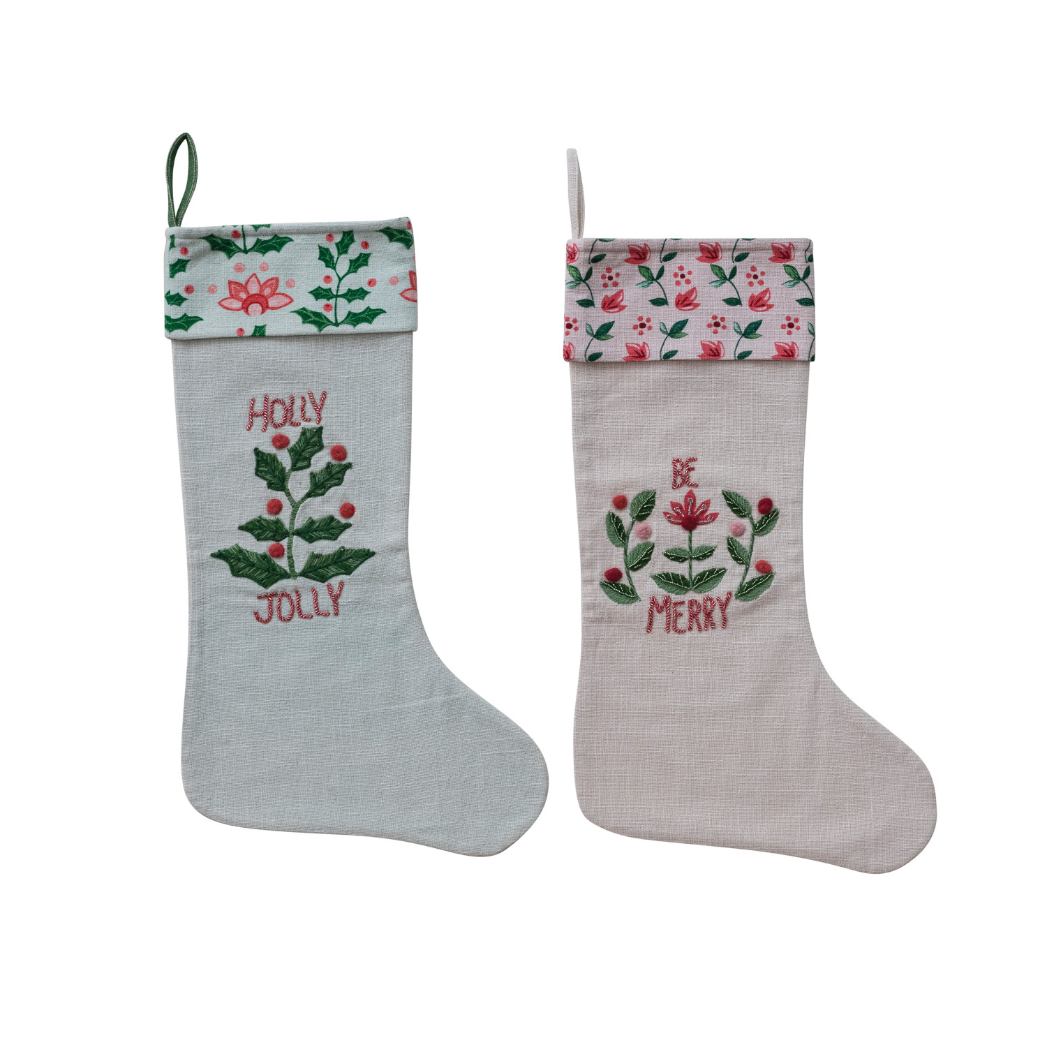 Catalog Name: 20"H Cotton Printed Stocking w/ Holiday Botanicals, Saying, Embroidery, Beads & Patterned Cuff, Multi Color, 2 Styles ©