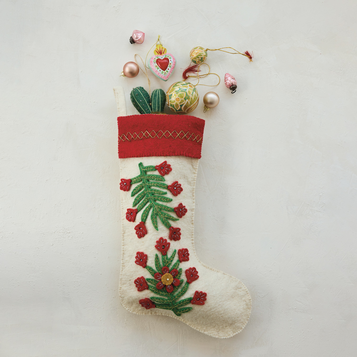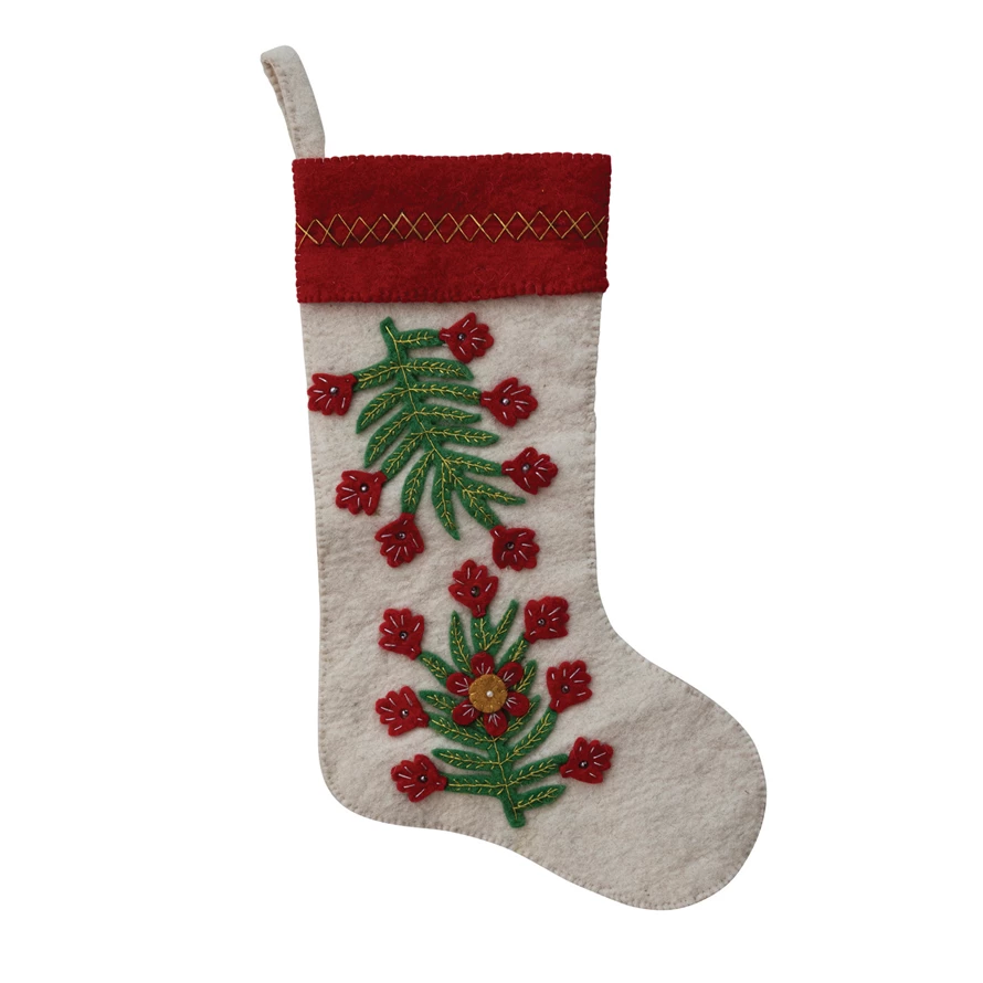 18"H Handmade Wool Felt Stocking with Appliqued Botanicals & Metallic Gold Thread Embroidery