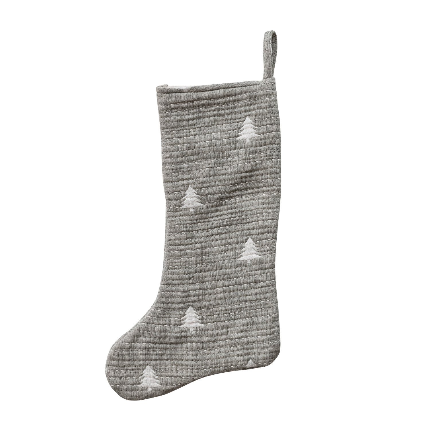 Catalog Name: 20"H Woven Cotton Double Cloth Stocking w/ Trees, Eyelash Fringe & Hand-Embroidered Kantha Stitch, Sage Color & Natural