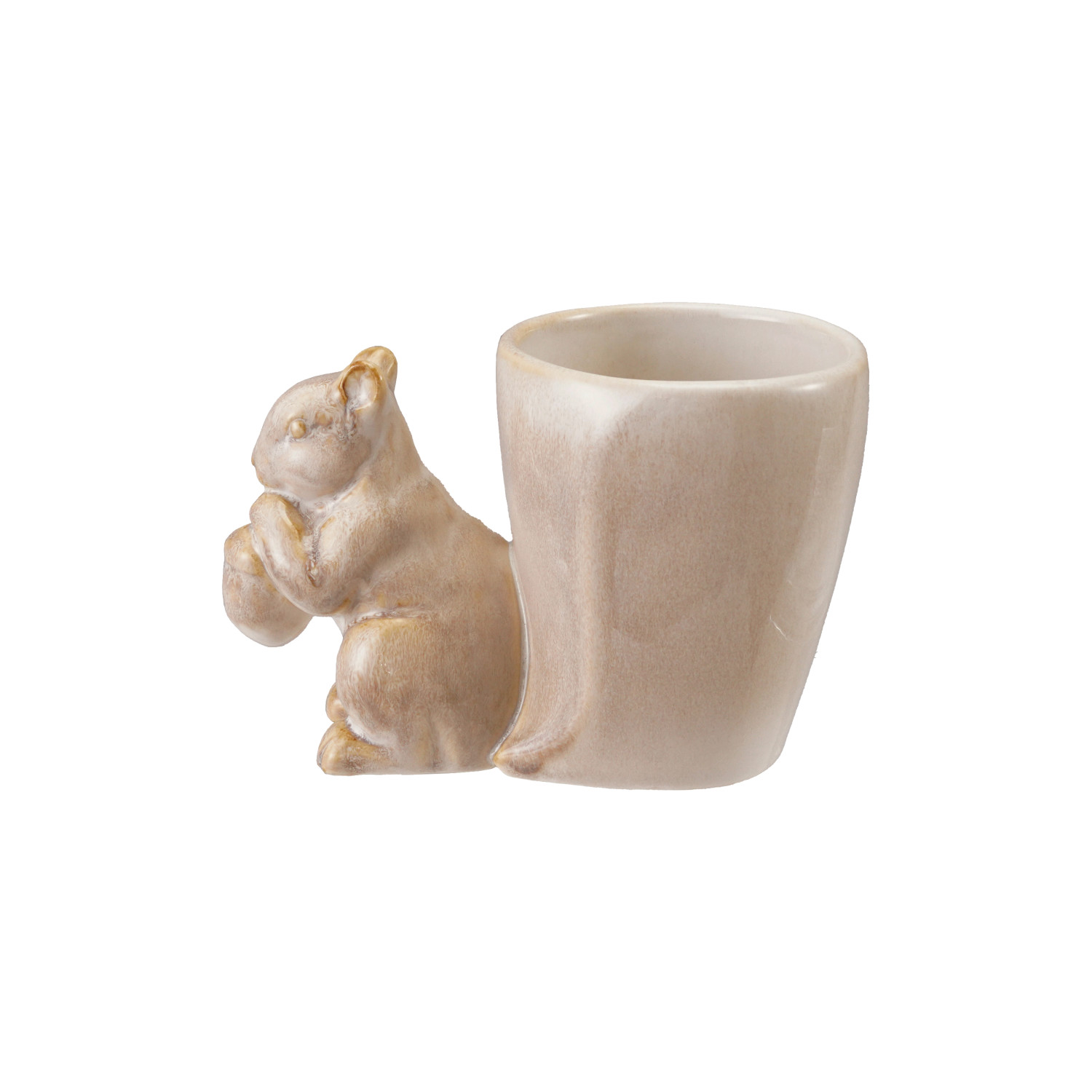 Catalog Name: 6"L x 3-1/4"W x 4"H Stoneware Mug/Vase w/ Squirrel, Reactive Glaze, Cream Color (Each One Will Vary)