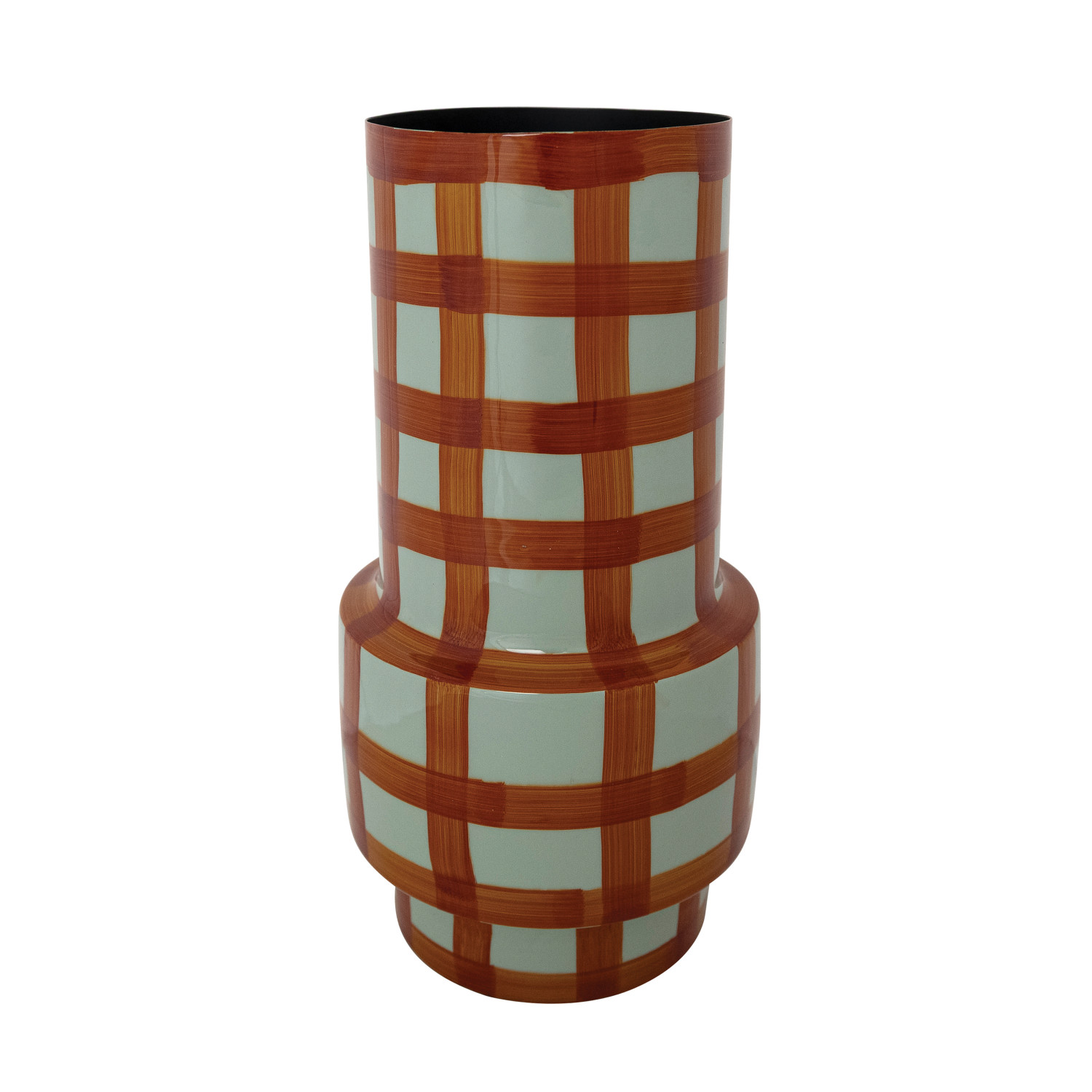 Catalog Name: 7-1/4" Round x 14"H Enameled Metal Vase w/ Grid Pattern, Light Blue & Rust Color