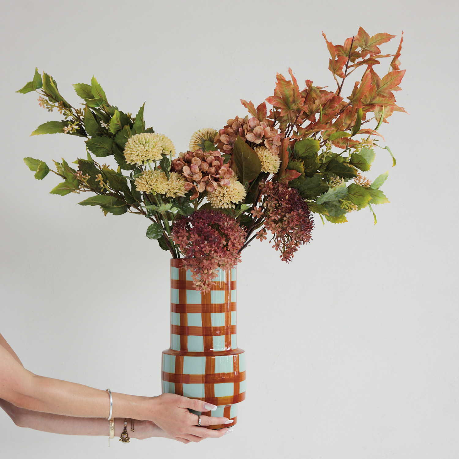 Enameled Metal Vase with Grid Pattern, Light Blue & Rust Color
