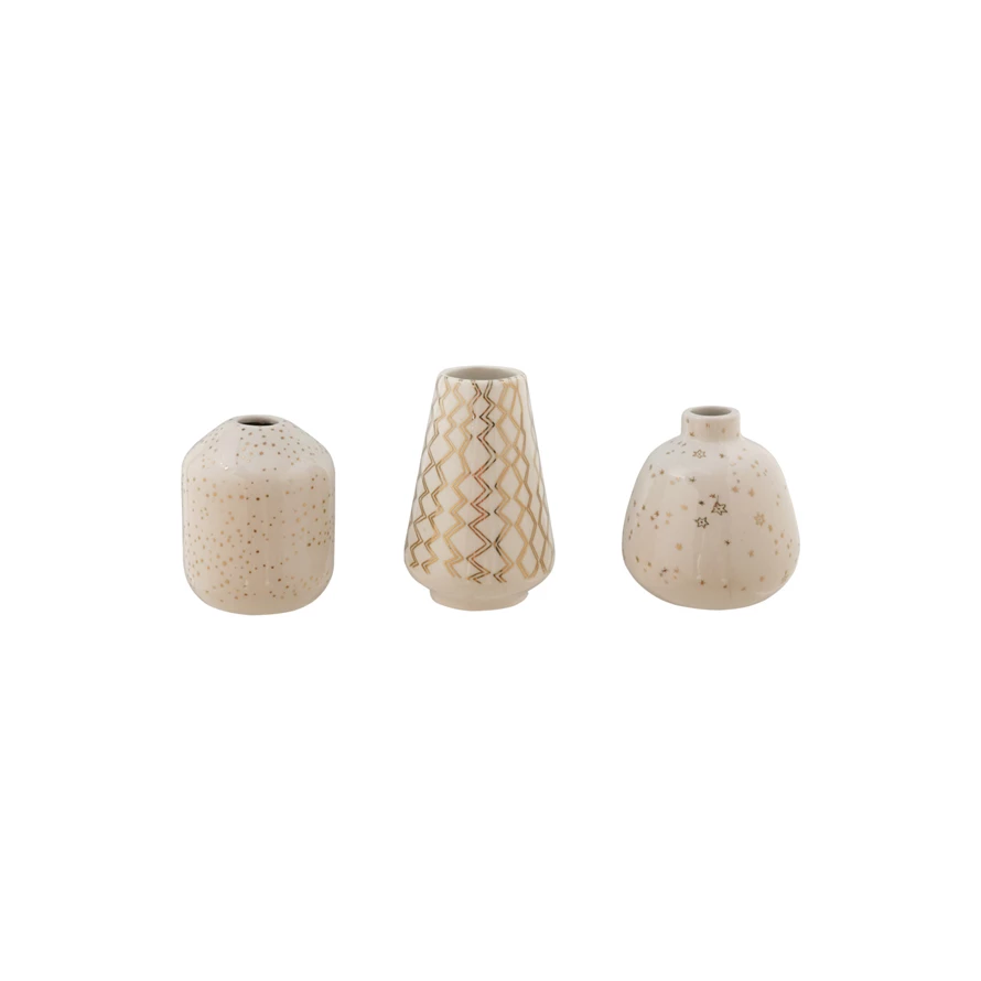 Catalog Name: 3"H - 4"H Stoneware Vase w/ Gold Electroplated Design, White, 3 Styles