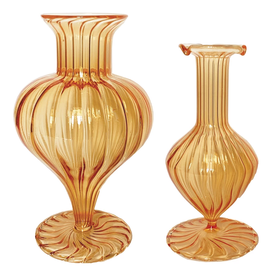 Hand-Blown Fluted Glass Footed Vase, Apricot Color, 2 Styles
