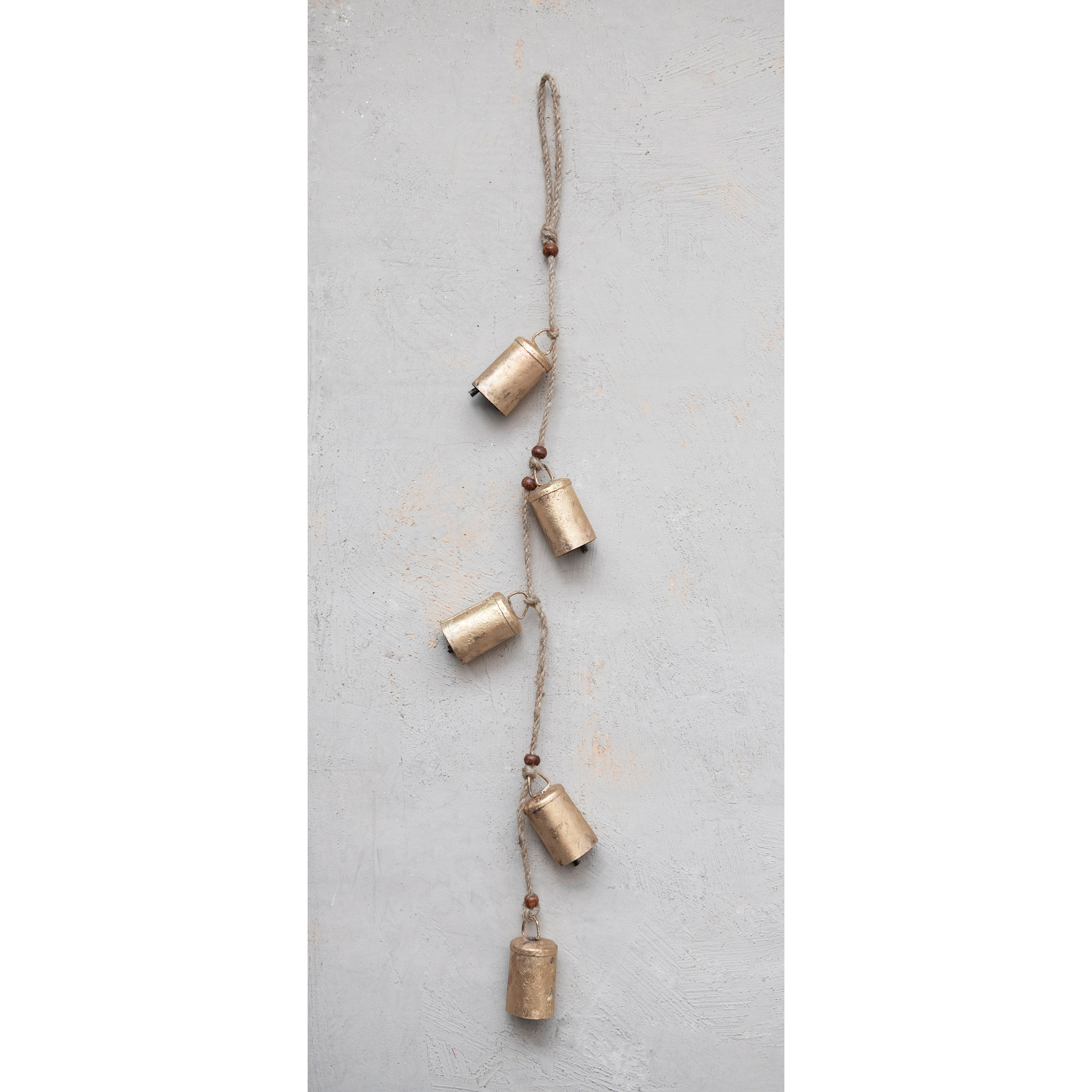 Catalog Name: 28"H Hanging Metal Bells w/ Wood Beads on Jute Rope, Antique Brass Finish