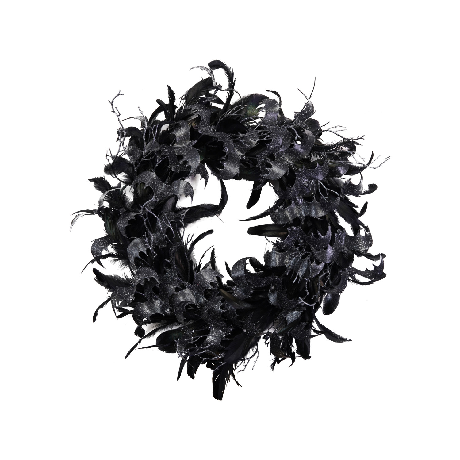 Catalog Name: 24" Round Feather Wreath w/ Glitter Bats, Black