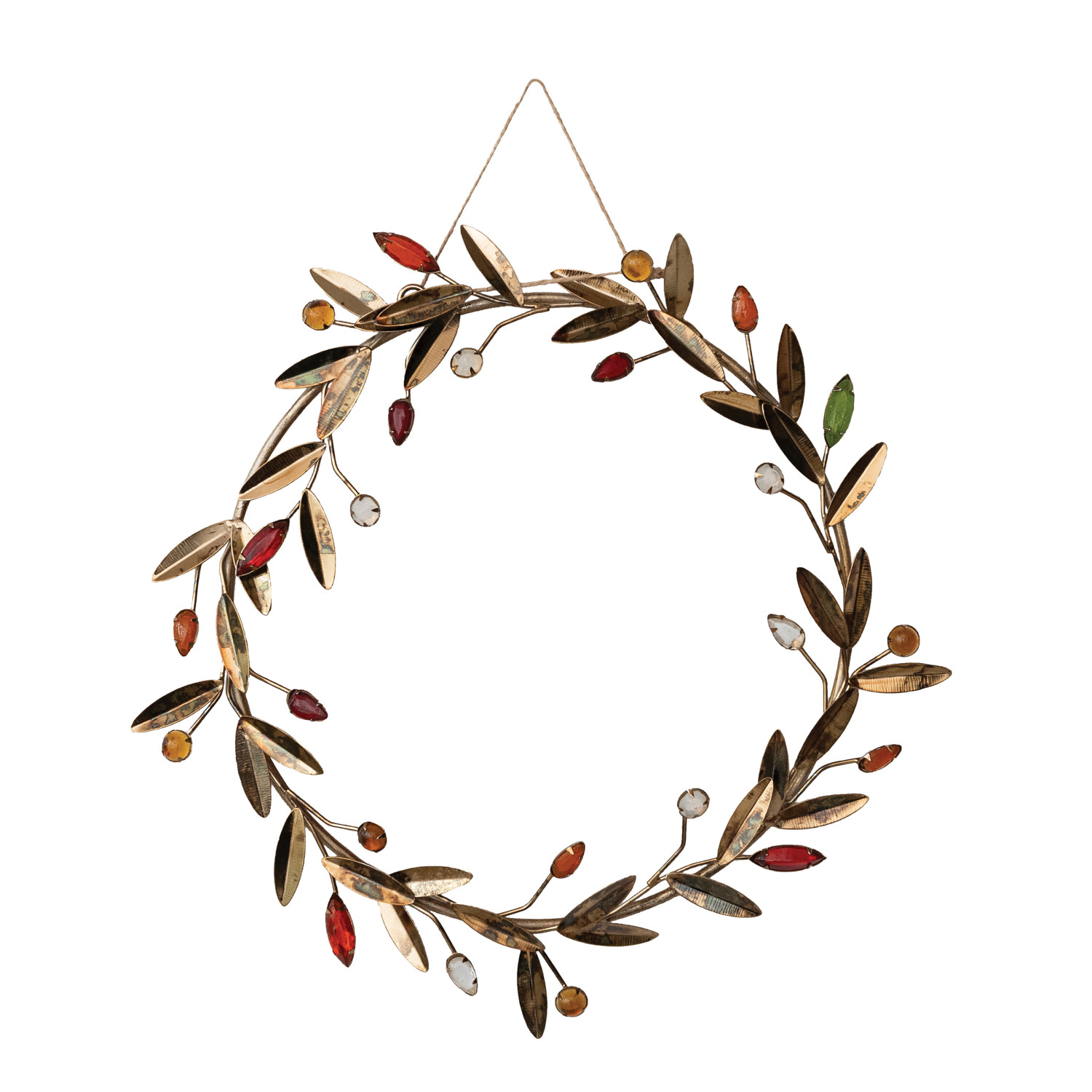 Metal Leaves & Acrylic Bead Berries Wreath, Antique Gold Finish & Multi Color