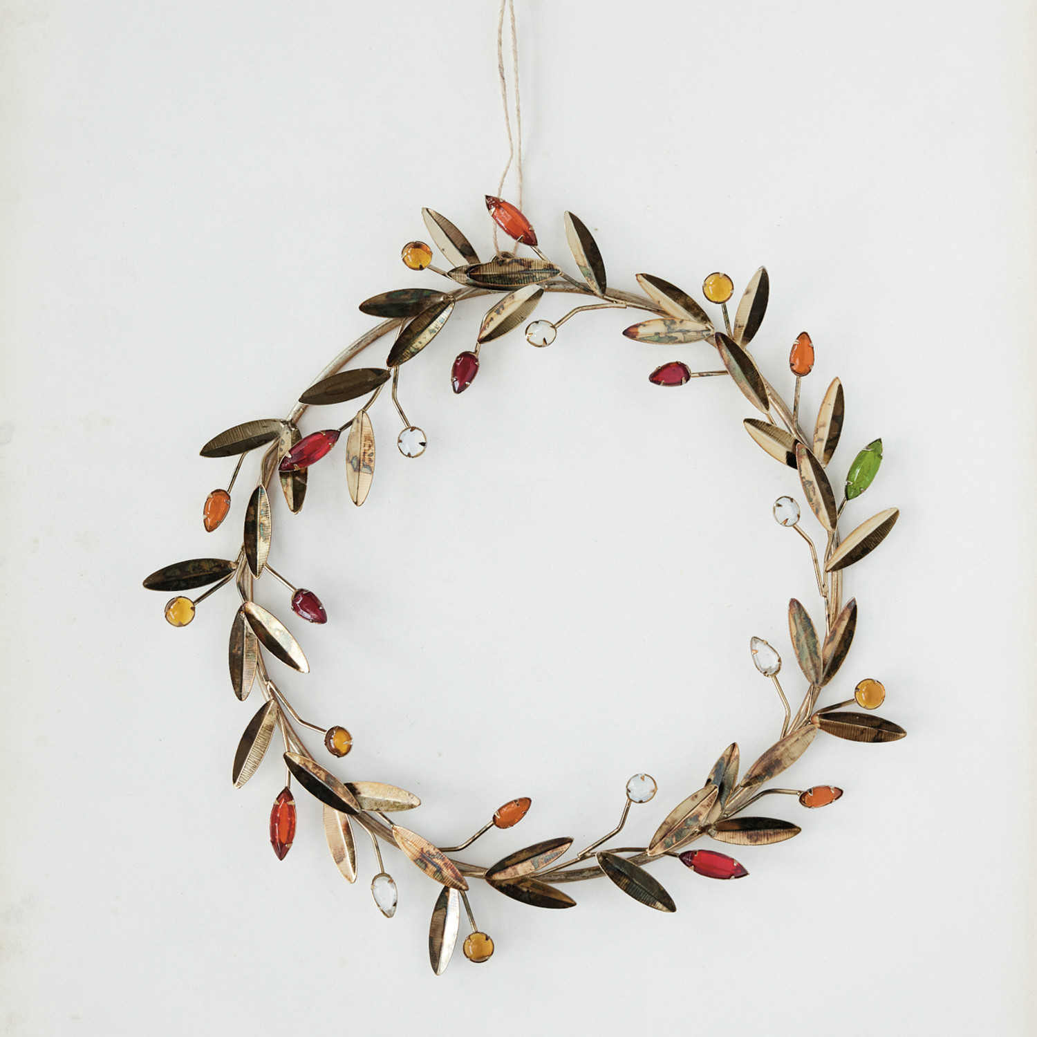 Catalog Name: 12-1/2" Round Metal Leaves & Acrylic Bead Berries Wreath, Antique Gold Finish & Multi Color