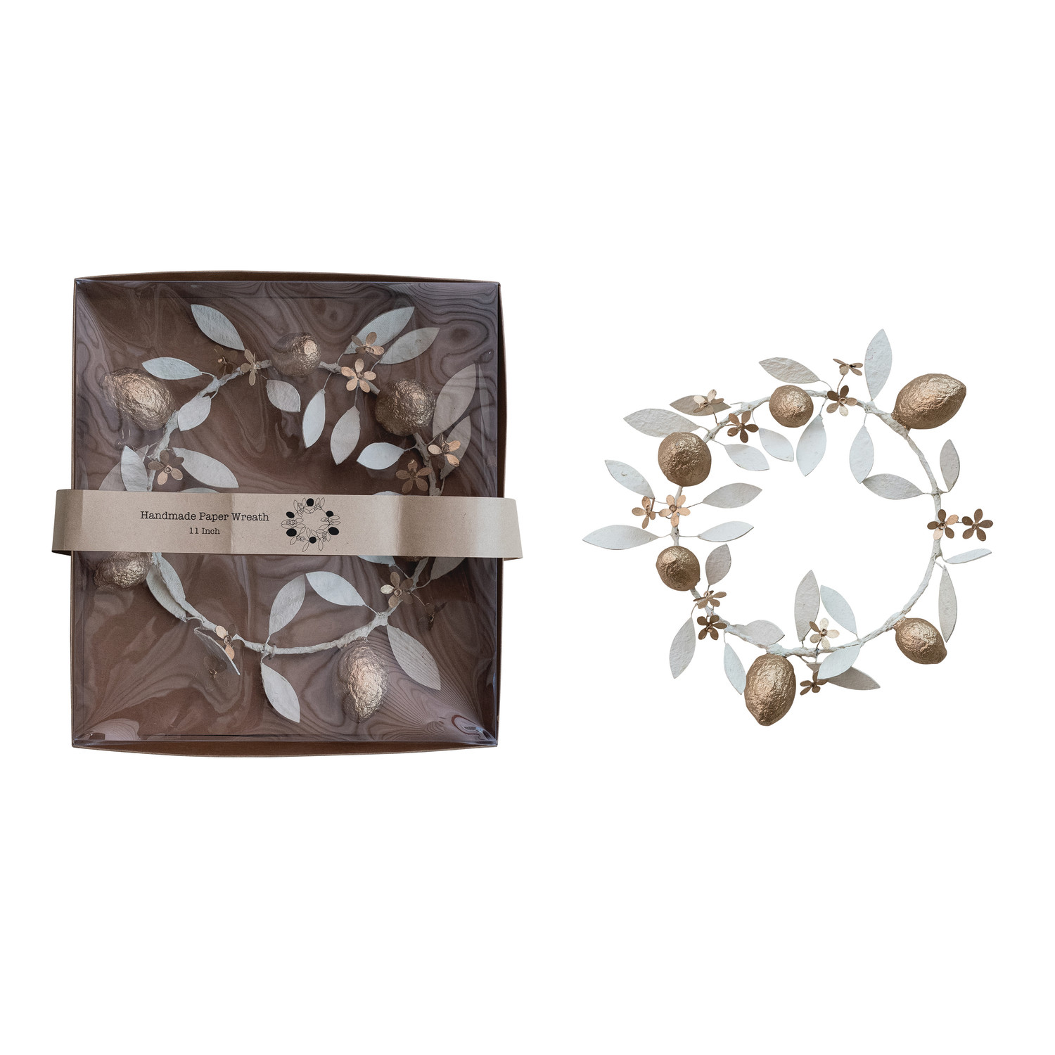 Catalog Name: 11" Round Handmade Paper Mache & Metal Lemons & Leaves Wreath w/ Flowers in Kraft Box, Cream Color & Gold Finish