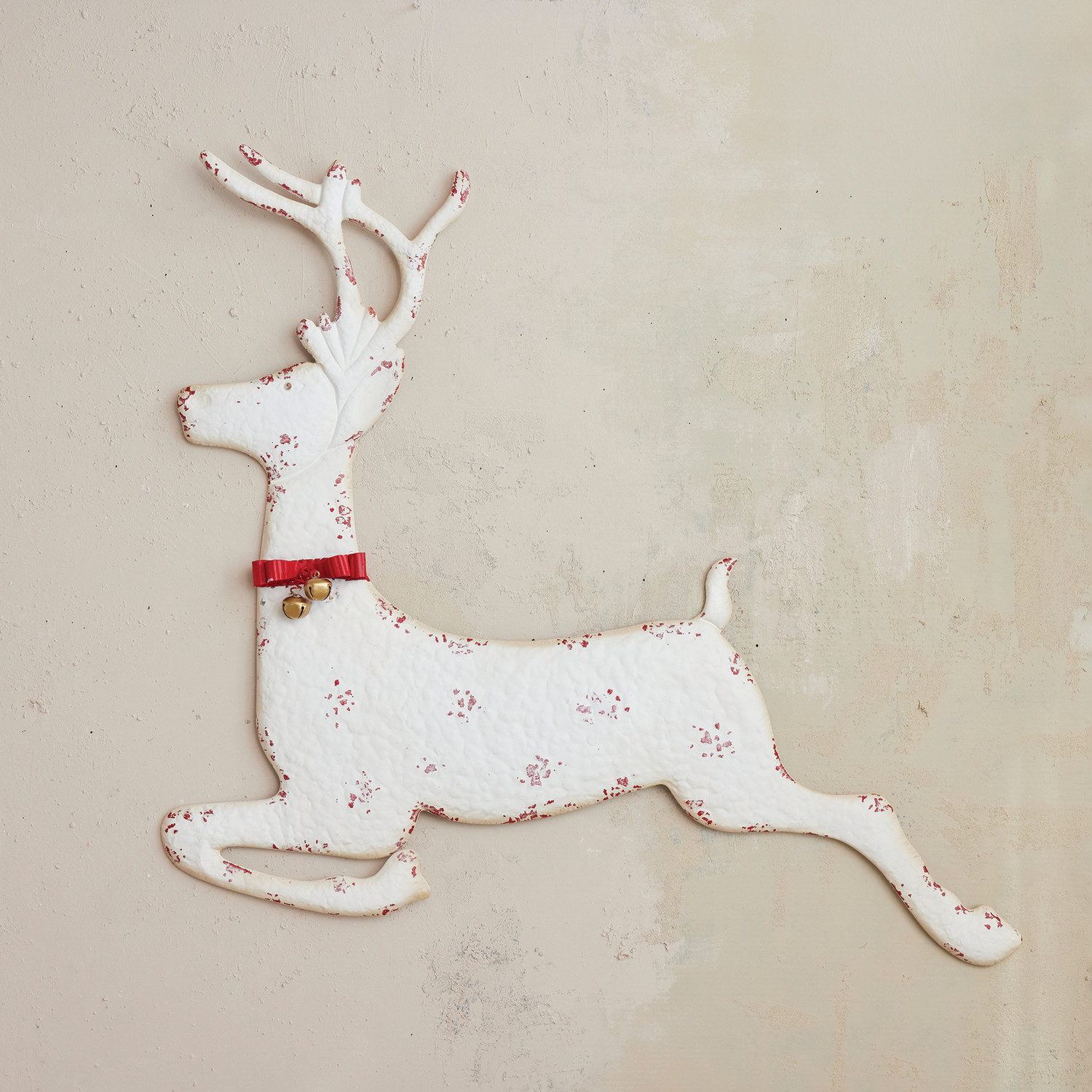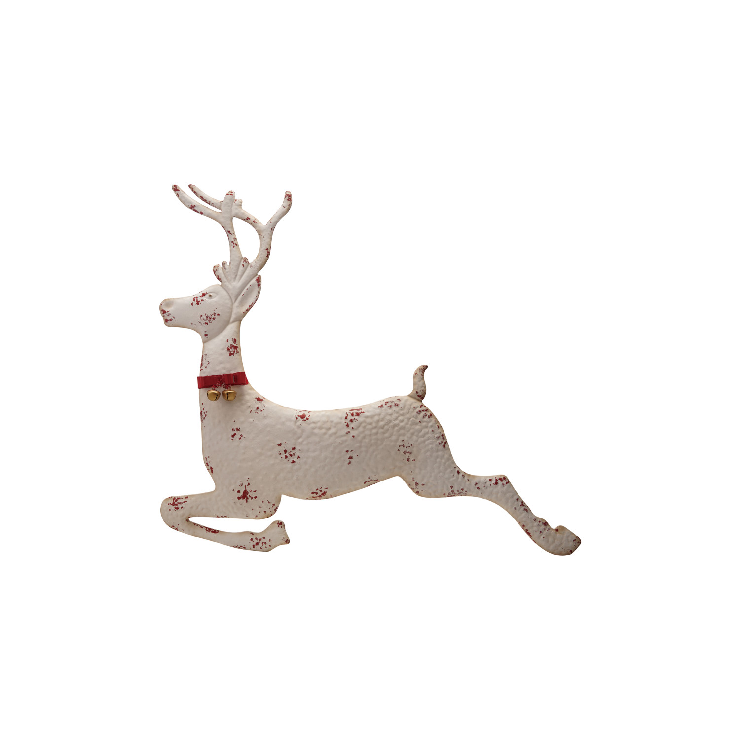Catalog Name: 42"W x 3"D x 37-1/2"H Metal Deer Wall Décor w/ Bow & Jingle Bells, Distressed Finish, White & Red, Truck Ship