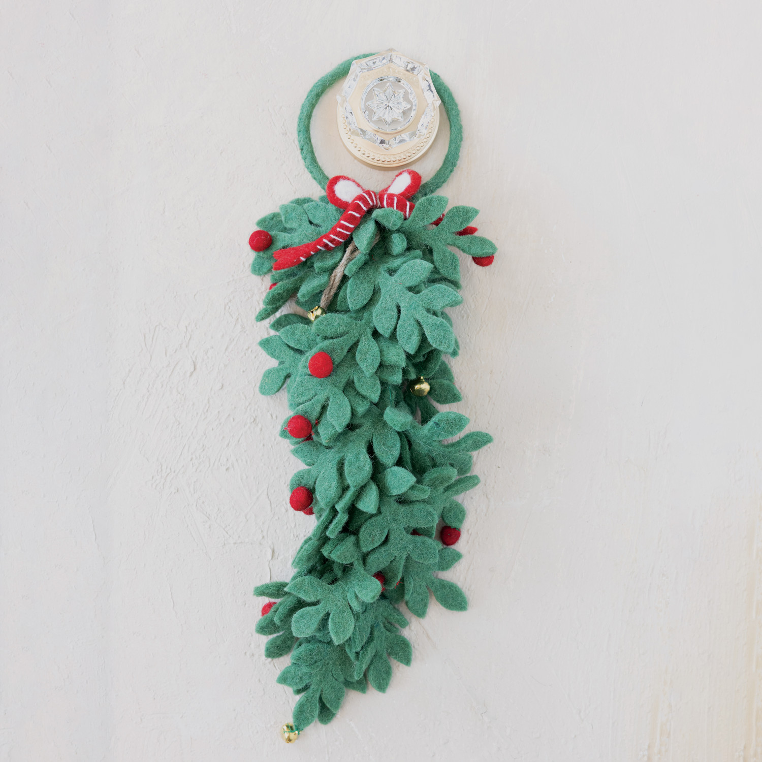 Handmade Wool Felt Leaves & Berries Door Hanger with Striped Bow & Jingle Bells, Green, Red