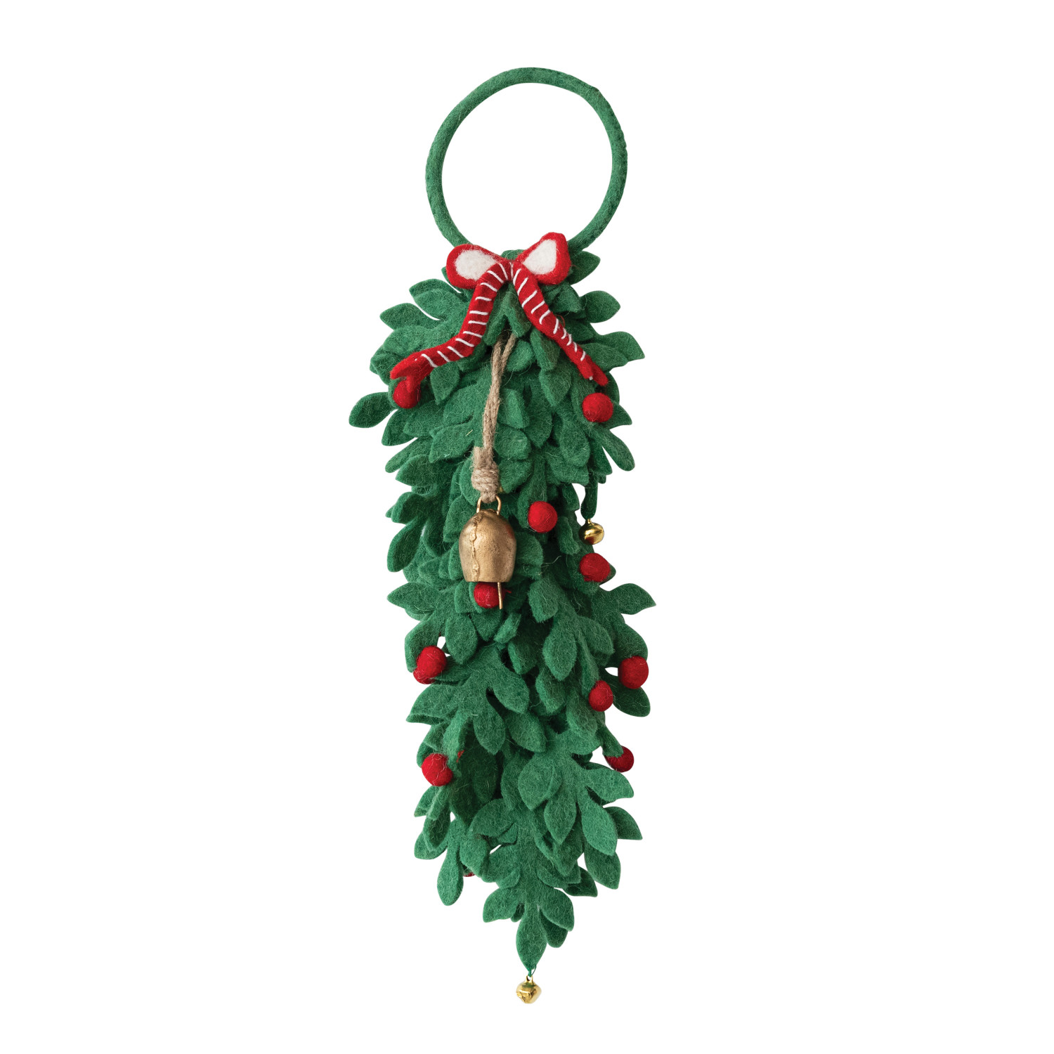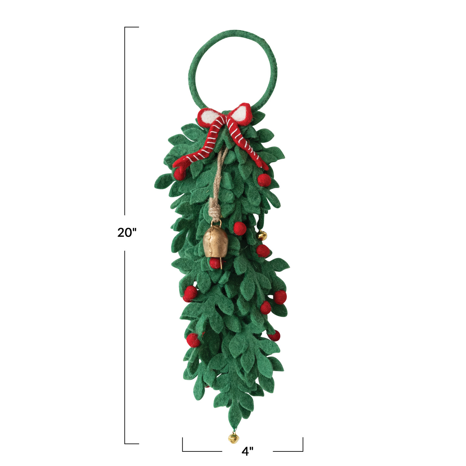 Handmade Wool Felt Leaves & Berries Door Hanger with Striped Bow & Jingle Bells, Green, Red