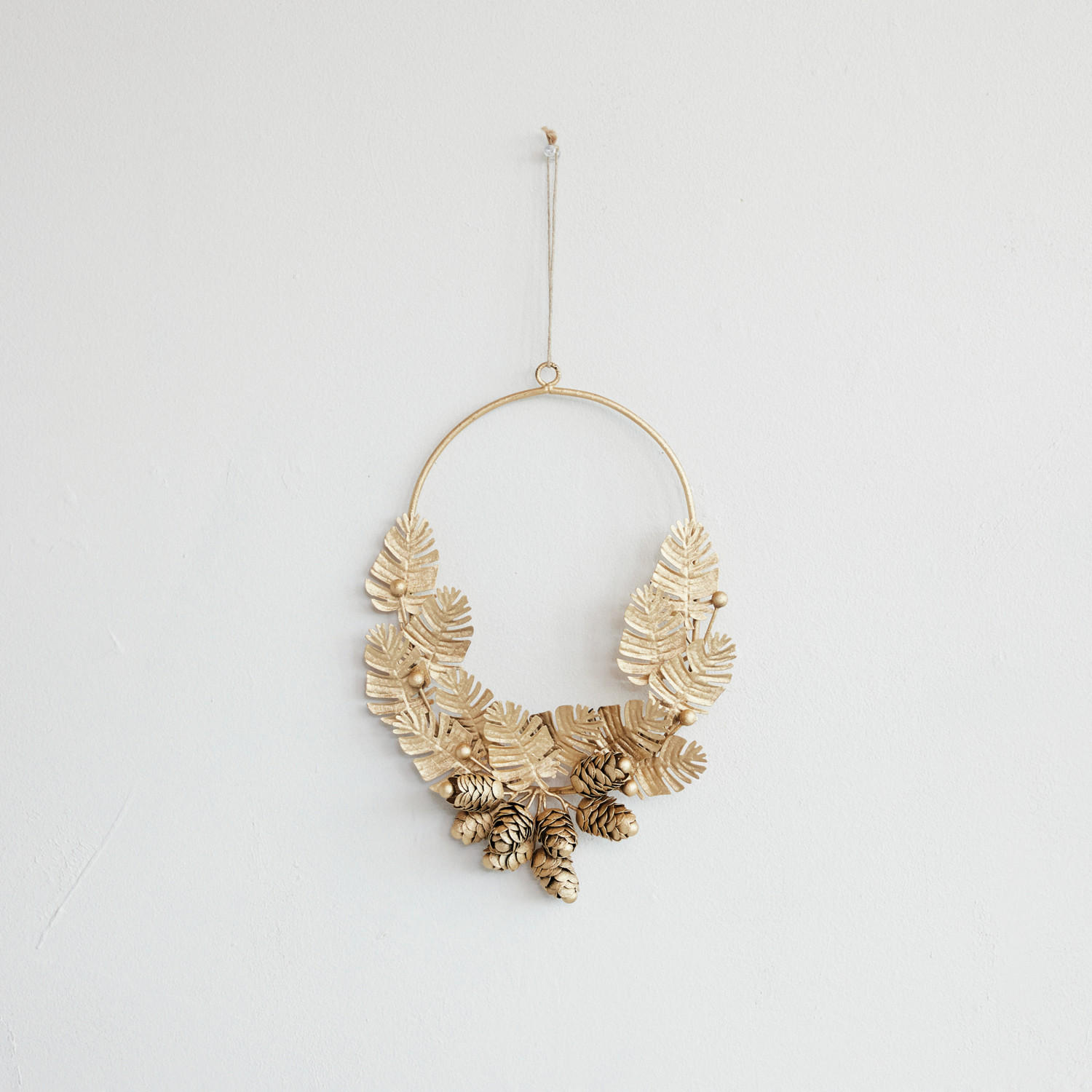 Metal Leaves Wreath with Pinecones, Antique Gold Finish